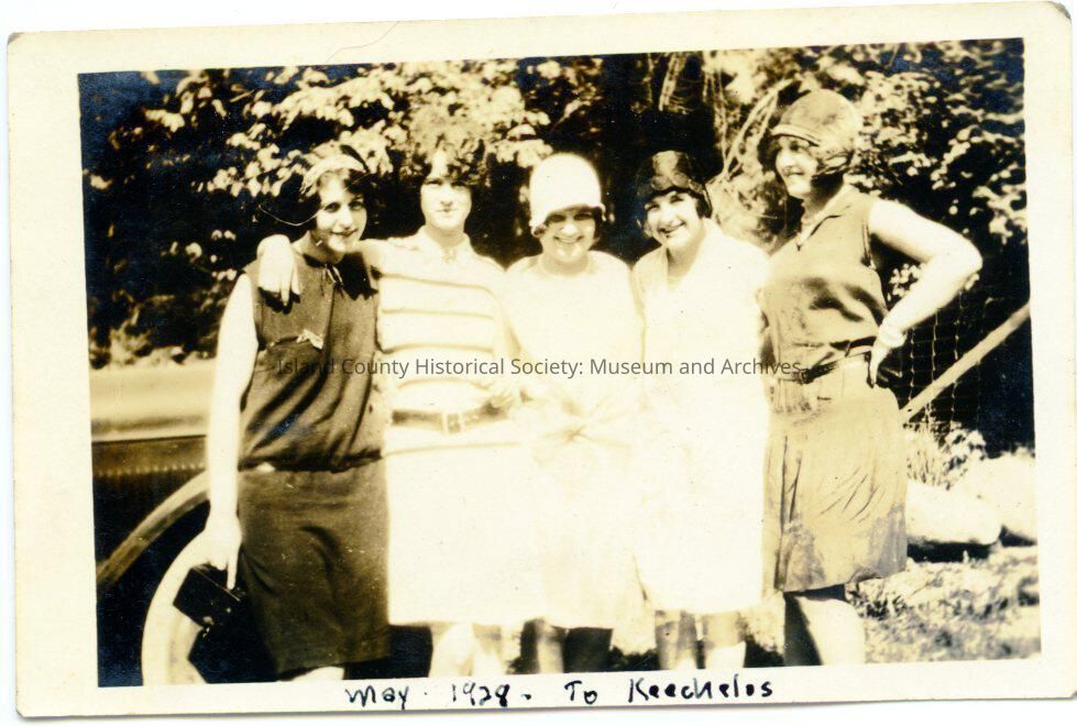 A black and white photo of five (5) women in dresses in front of a car. Four are wearing hats. The woman on the left is holding a camera. On the bottom: "May 1928 To Keechelos". (Probably Lake Keeshelos near Yakima.)