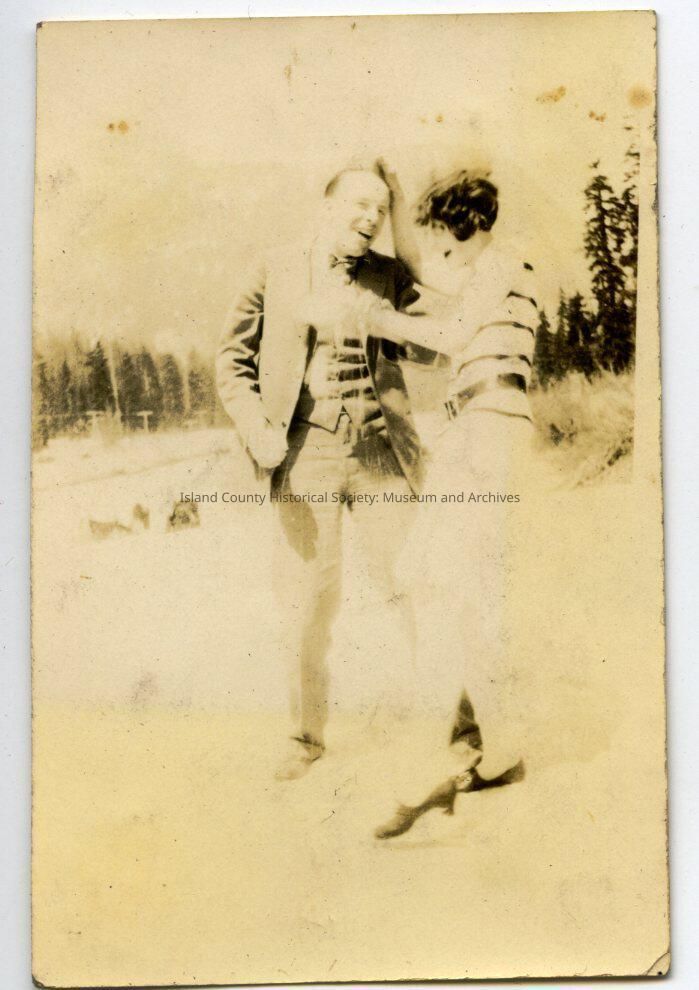 A black and white photo of a man and a woman standing on a road with mountain in the background. They are holding snow balls but she is wearing a sleeveless top, skirt and shoes. He is in a three-piece suit. She has her hand on his head. On the back is written: "Geo Lake Keechelus" (There is a Lake Keechelos near Yakima.) George Kellogg and maybe Pauline.