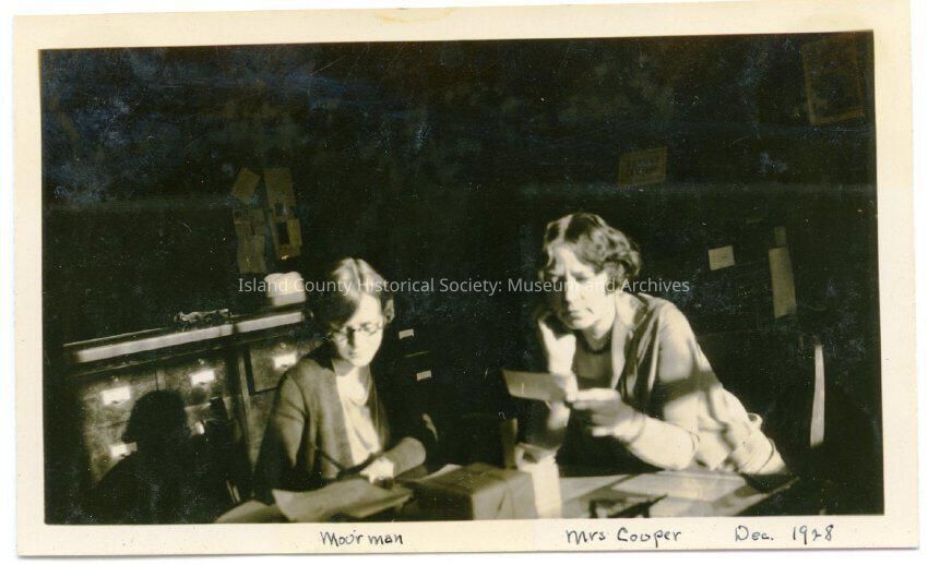 A black and white photo of two women in an offfice looking at papers. There is a box with string tied around it on the table. Behind them are file cabinets or drawers. On the bottom: "Mourman Mrs. Couper ((?) Cooper) Dec 1928"