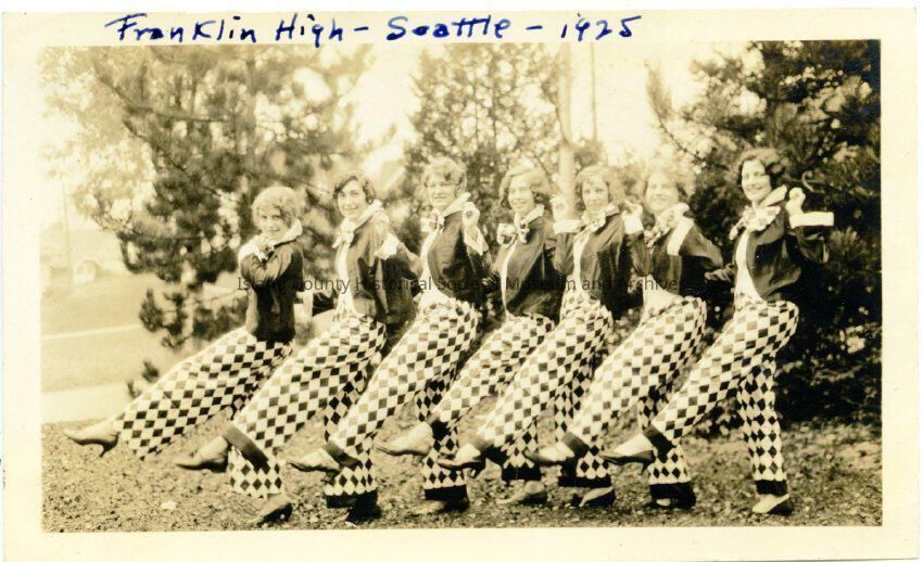 A black and white photo of seven (7) young women in jackets, large diamond patterned trousers, matching big bows, shoes. All standing in a row sideways to the camera. On the top: "Franklin HIgh - Seattle - 1925"