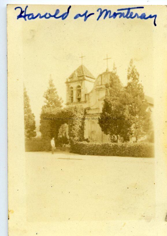 A black and white photo of a man in front of an ivy covered archway in front of a mission/church. On the top: "Harold at Monteray" (sic)