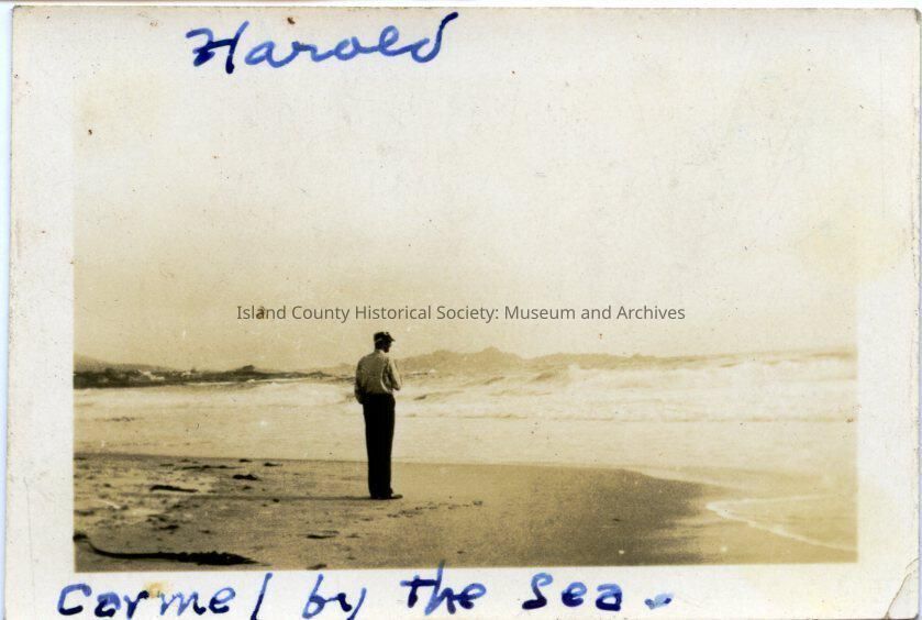 A black and white photo of a man standing on a beach looking seaward. On the top: "Harold" and on the bottom: "Carmel by the Sea." Related to 2015.074.279.