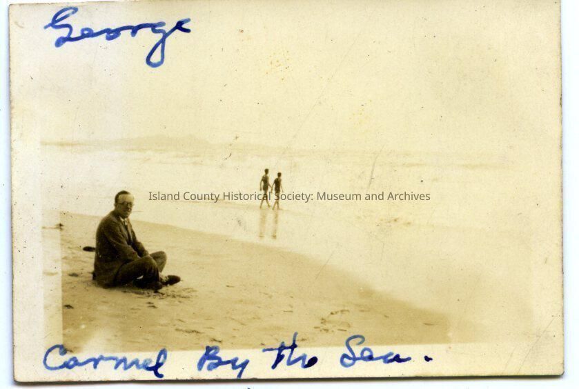 A black and white photo of a man sitting on the beach in a suit. There are two people in the water. On the top: "George" and on the bottom: "Carmel by the Sea." Related to 2015.074.278.