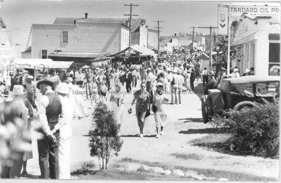 A mounted partially colored photograph entitled "Coupeville carnival". On the back it states that this is during a 1930s water festival. Stamped in purple: "Dodge Bldg. Enterprises" and then a Clinton address for E.H.Dodge. The picture is of Front Street with lots of people milling about, stalls propped up, a car on the right hand side and sign saying: "Standard Oil Pr-".Collection