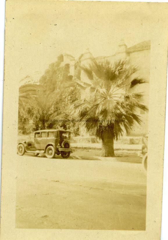 A black and white photo of a four-door car parked in a road beside a sidewalk and just in front of a large palm tree. There is a large building in the background.