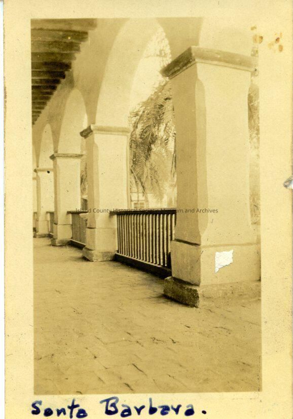 A black and white photo of an arched walkway with metal railings and stone or brick floor. Wood beams on the roof. Related to 2015.074.284-.286.