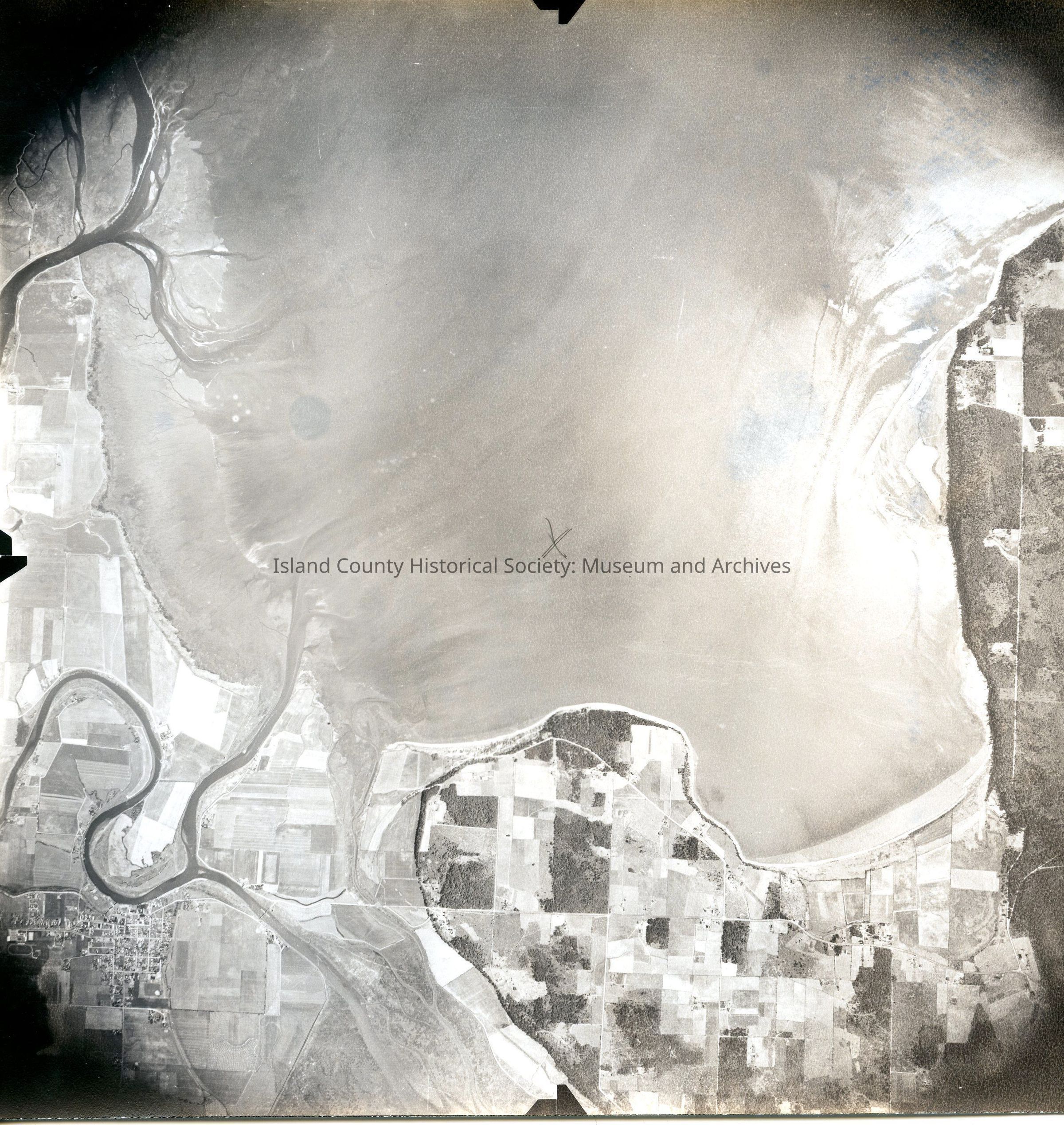 Donated by Island Conservation District 7-9-41 GS S 3 193 Big Bay taking up center of frame, town in lower left of picture. On back "'Camano Island and Stanwood"' See GIS for digital copies.