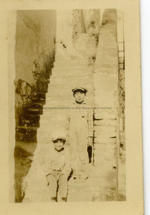 A black and white photo of two boys wearing flat caps in front of stone steps - one sitting and one standing.