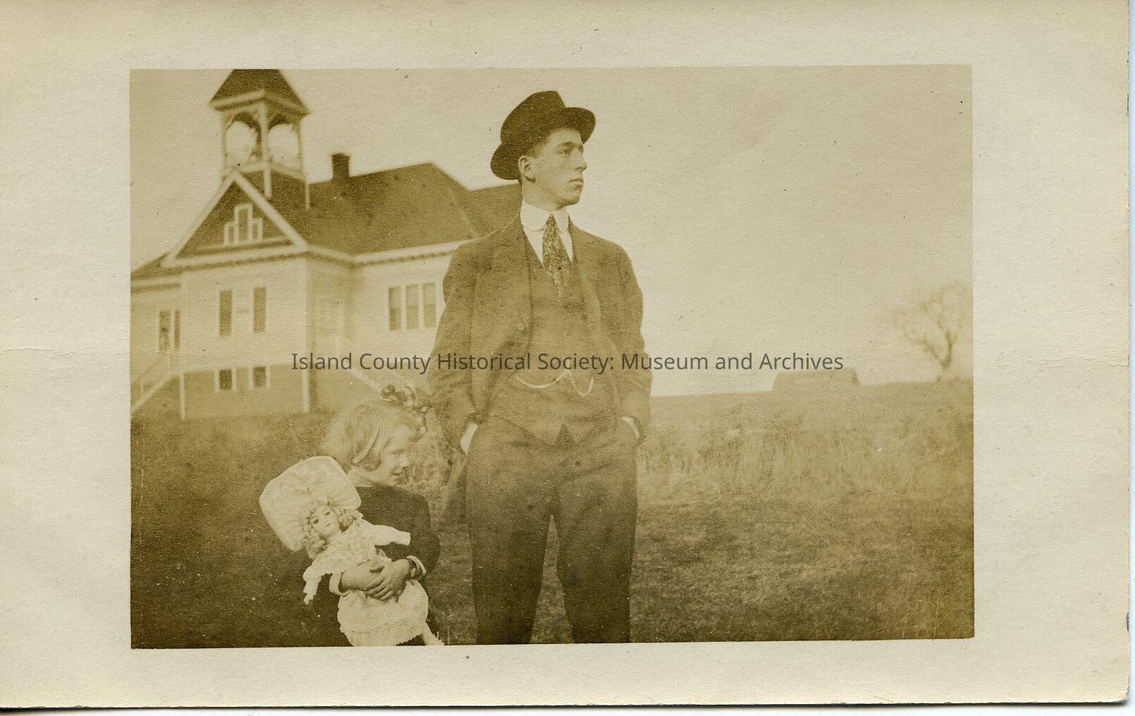 A photo of a man and a young girl holding a doll, outside of a school. Handwritten on the back is "Harold Hill & Phyllis? Central School, Oak Harbor, 1902 - 1934, Later moved to 700 W. Burned down --."Made/Created