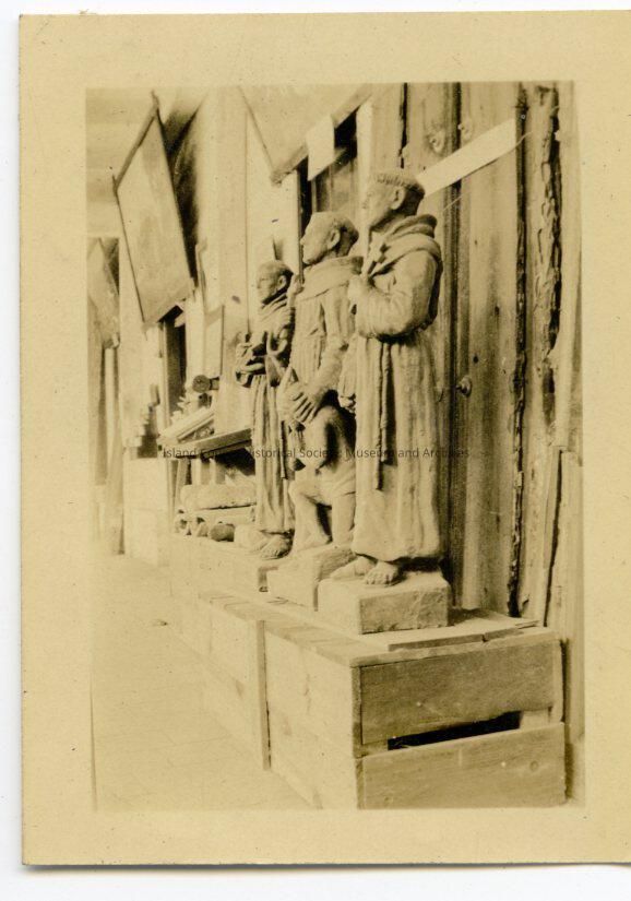 A black and white photo of three statues of priests in cassocks on top of crates. There are three paintings on the wall. Related photos: 2015.074.288-.298.