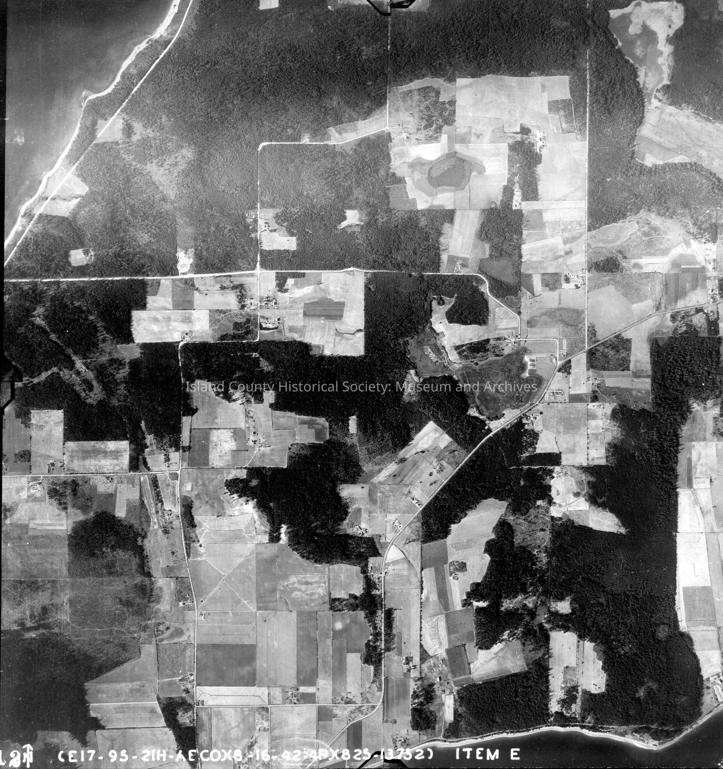 Donated by Island Conservation District Taken on 16 Aug 1942 "Copied Dec 20 1950" Front reads '' 12 17-98-21H-AECOX8-16-42-4PX825-(3752) ITEM E'' Picture of land north of penn cove. Back reads ''Penn Cove'' See GIS for digital copies.