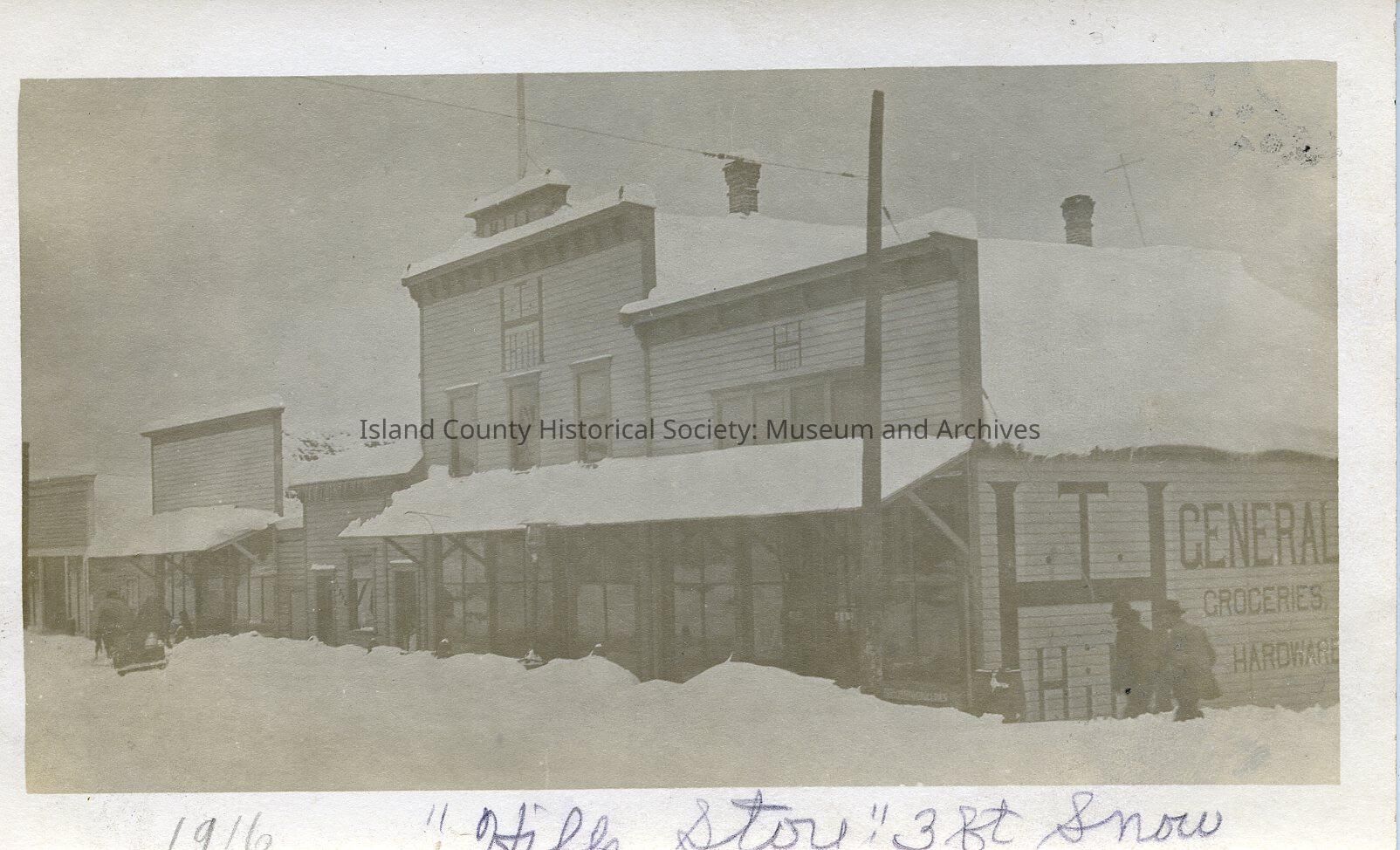A photo of a store front with high snow on the ground. Handwritten on the front is "1916 Hills Store. 3 ft snow."Made/Created