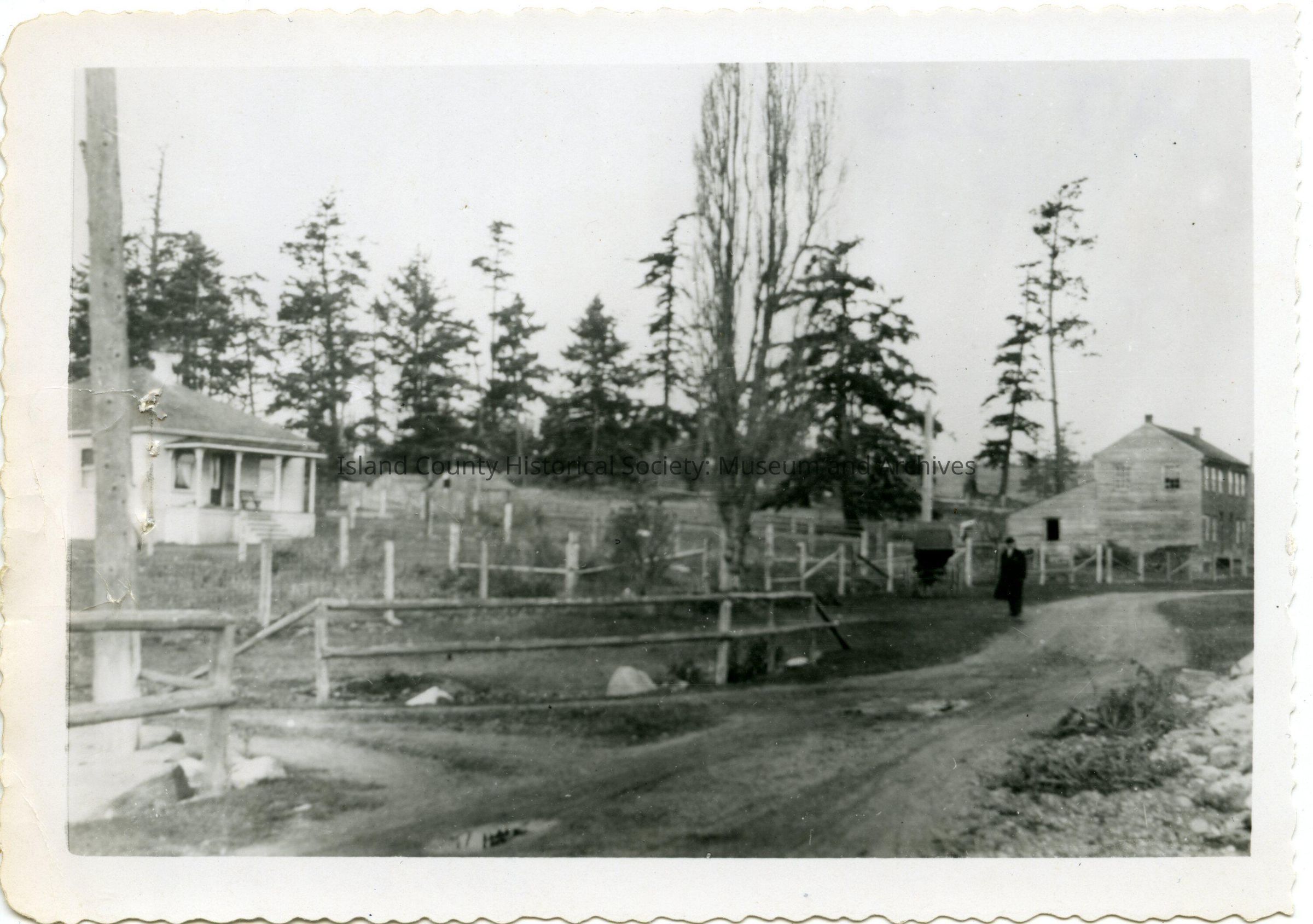 Photo of the old courthouse in Coveland/San de Fuca. Dirt road with a man walking along. Split rail fence, trees, and a house on the left. From old entry: Photo (negative AT 325b): "Old Courthouse on the right"