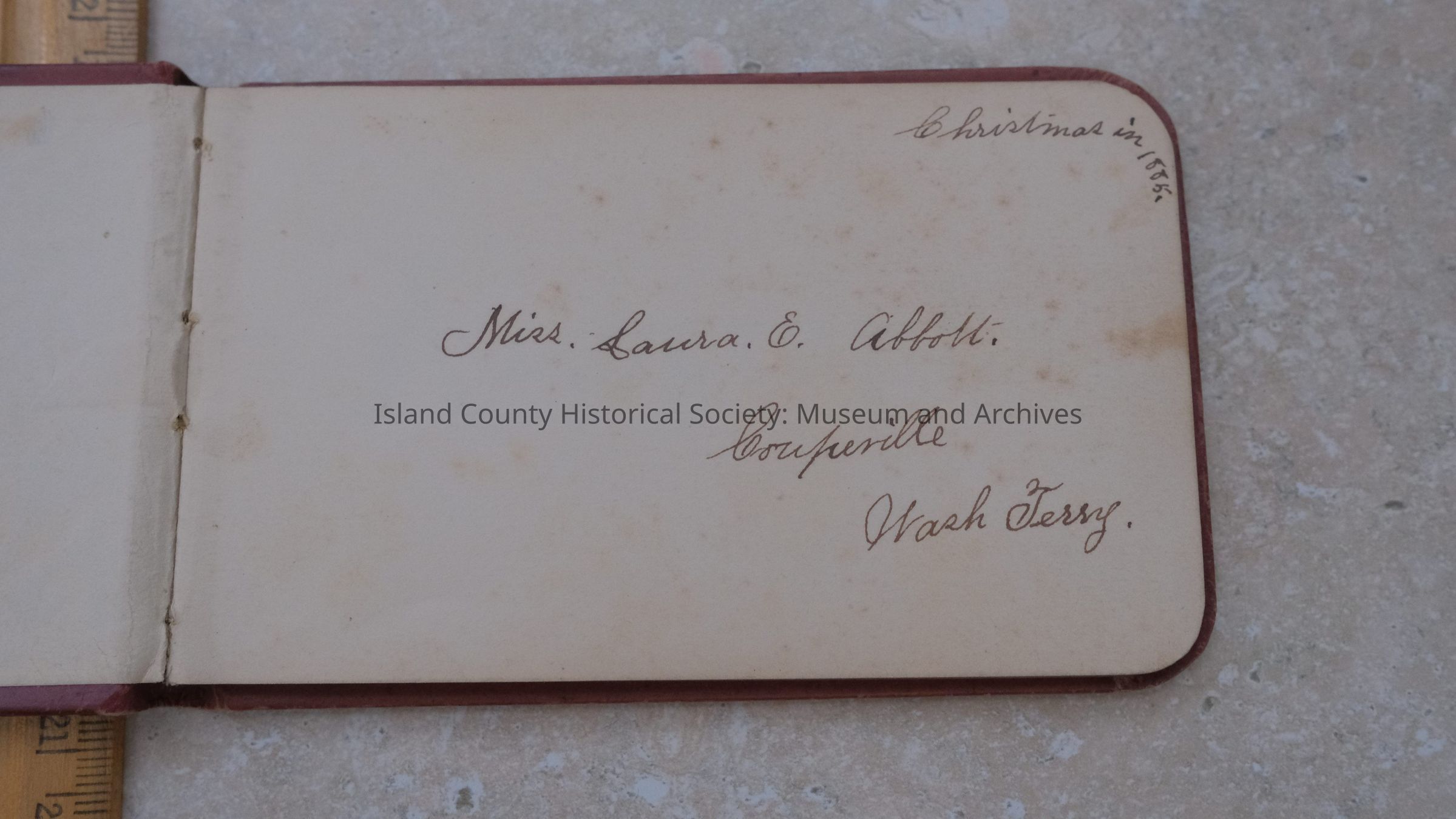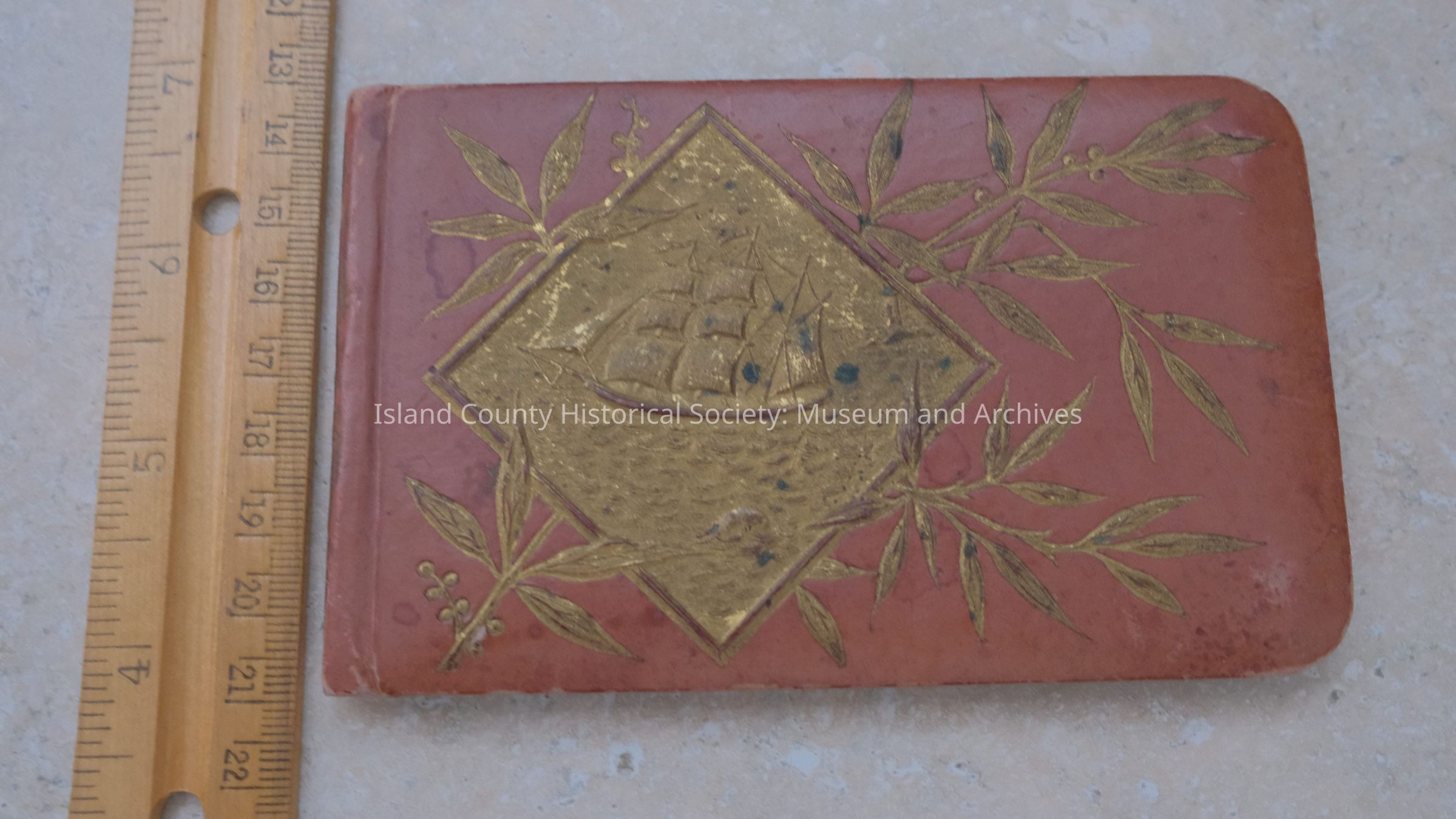 Autograph book owned by Miss Laura E Abbott of Coupeville. Stained and worn cover- light brown with inscribed ferns in gold stemming from it and inside are birds, sea and ship with a buoy and lighthouse. Indented design also on the back (fading red colour). Paper is foxing.
