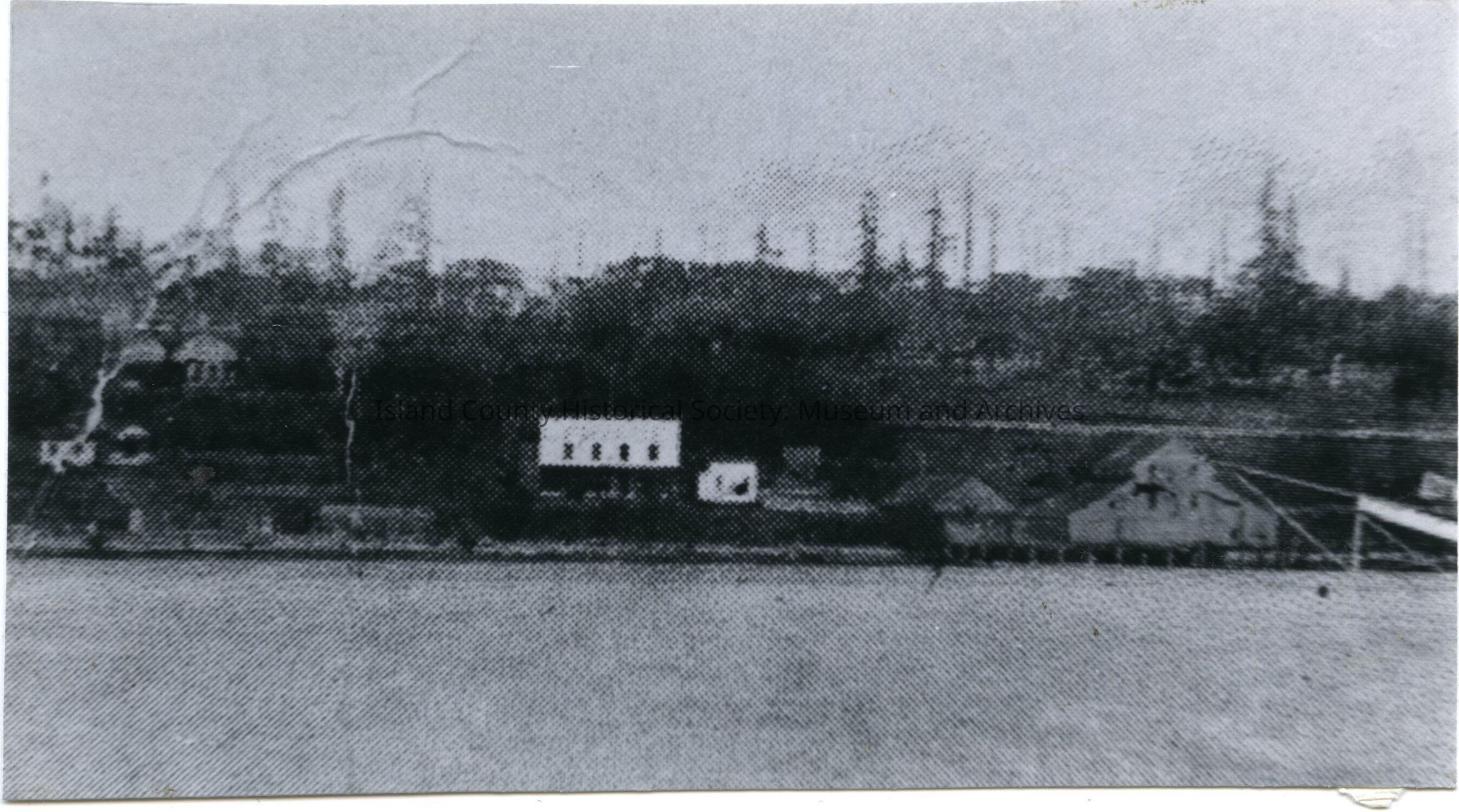 Photograph of a view of buildings along the shoreline with trees in the background. This is probably Crescent Harbor as it is in a folder labeled Crescent Harbor. From folder: Crescent Harbor