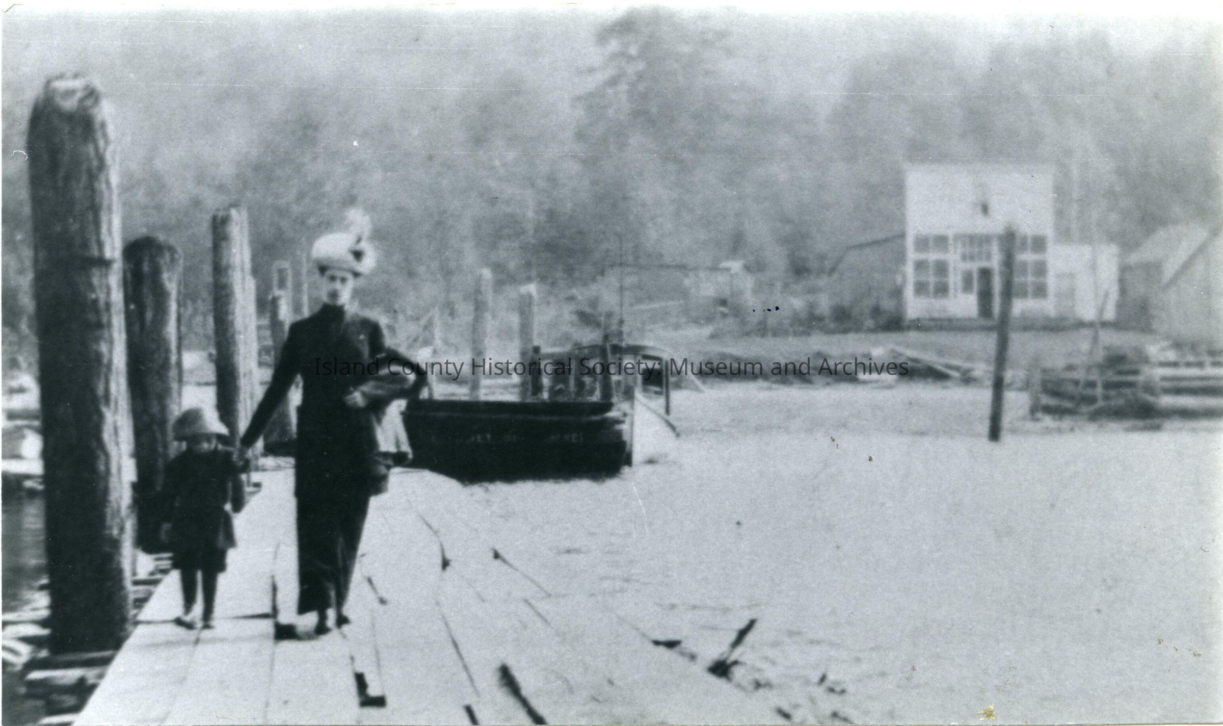 Photograph of a woman and little girl walking on a dock, boat and store in the picture also. They are both wearing hats, the woman is wearing a coat and looks like she is carrying the girl's coat on her left arm. From folder: Crescent Harbor
