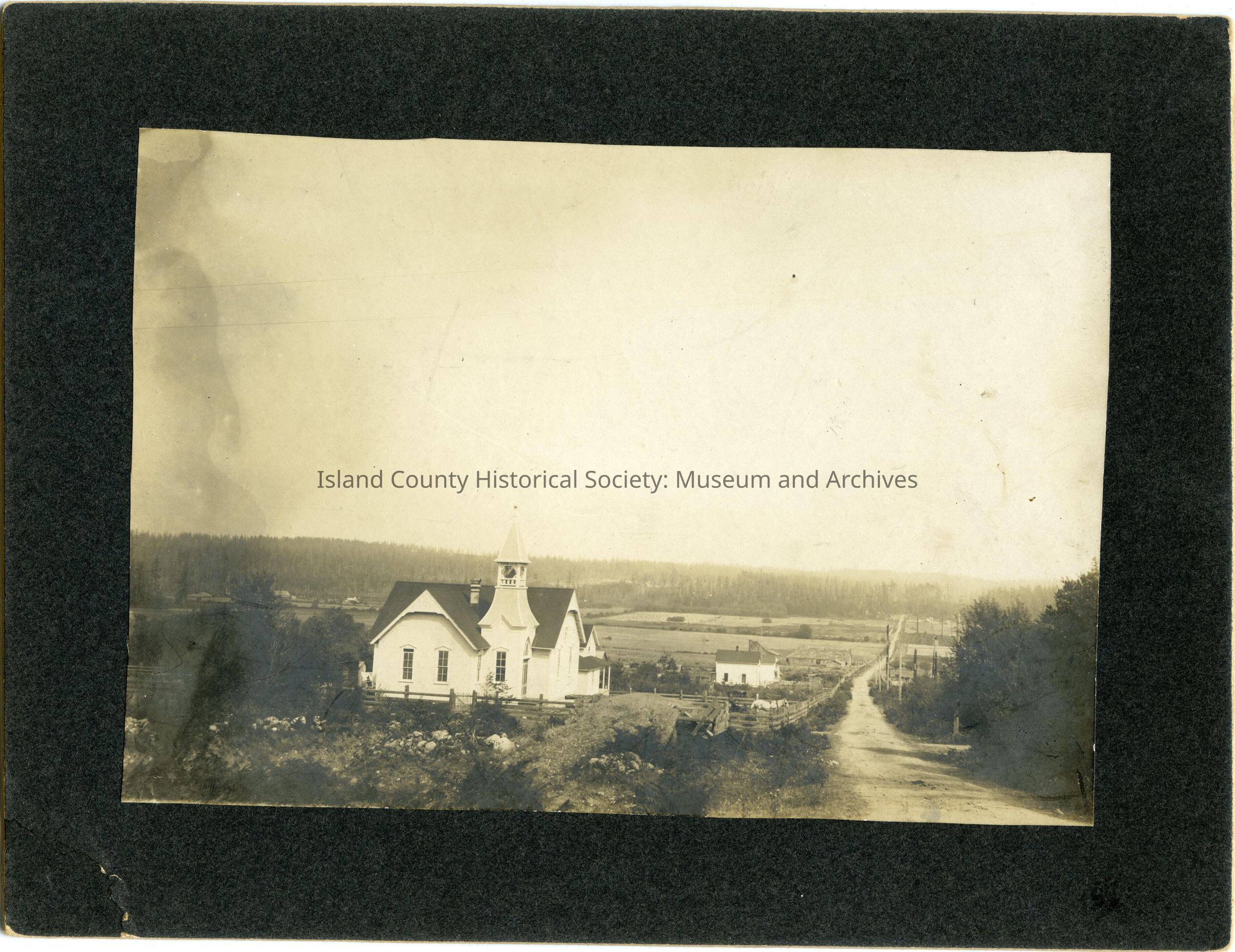 Photograph of a church with bell in steeple. Steep pitched rooflines. From other photos - this is the Methodist Church, Crescent Harbor, Washington. There is a group of people on the front porch and around the sides of the church. A house is next door, possibly a parsonage. Fence in the foreground and some trees; the rest of the land has been cleared. A dirt road runs fairly straight in front of the church and into the distance. Mounted photograph of "Methodist Church, Crescent Harbor, WN. The church was abandoned and torn down about 1920"
