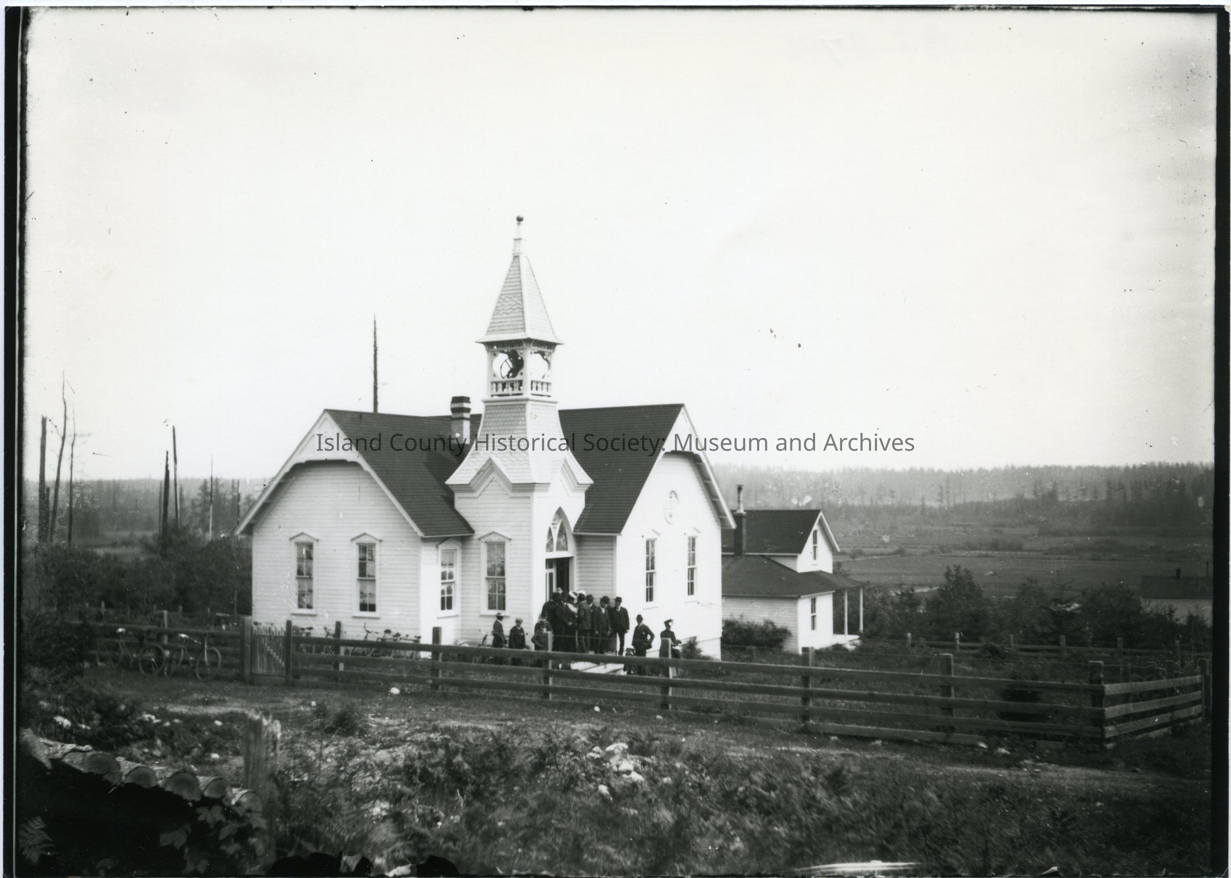 Photograph of a church with bell in steeple. Steep pitched rooflines. From other photos - this is the Methodist Church, Crescent Harbor, Washington. There is a group of people on the front porch and around the sides of the church. A house is next door, possibly a parsonage. Fence in the foreground and some trees; the rest of the land has been cleared.