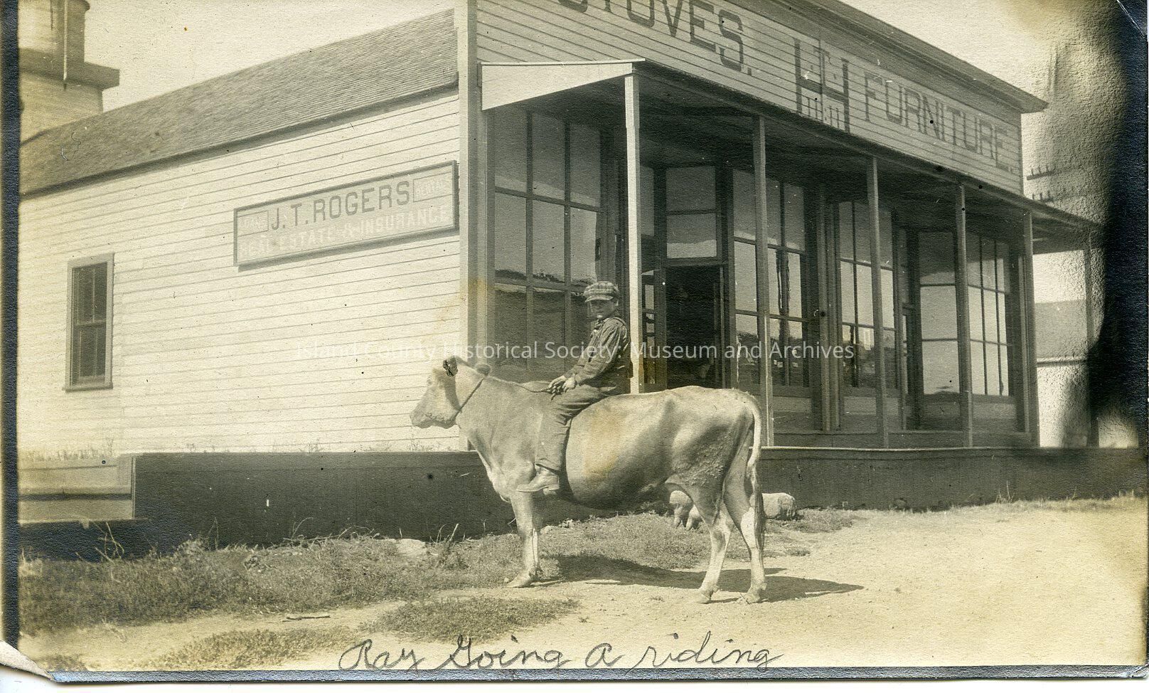 A photo of the front of a store with a man sitting on a cow. Handwritten on the front is "Ray Going A Riding." Handwritten on the back is "Harvey Hill Store. Ray Davis? Oak Harbor? "