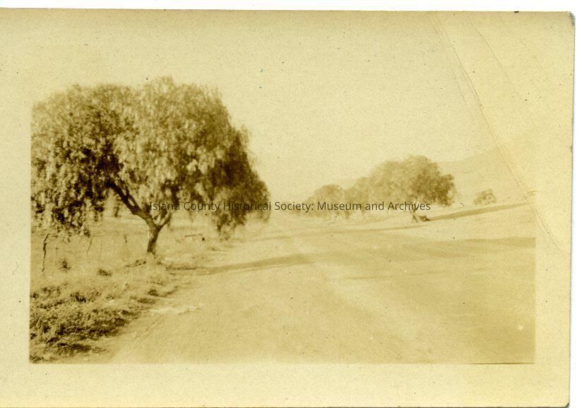 A black and white photo of a dirt road with trees. There is a car off the right side of the road. Related photos: 2015.074.300-.311.