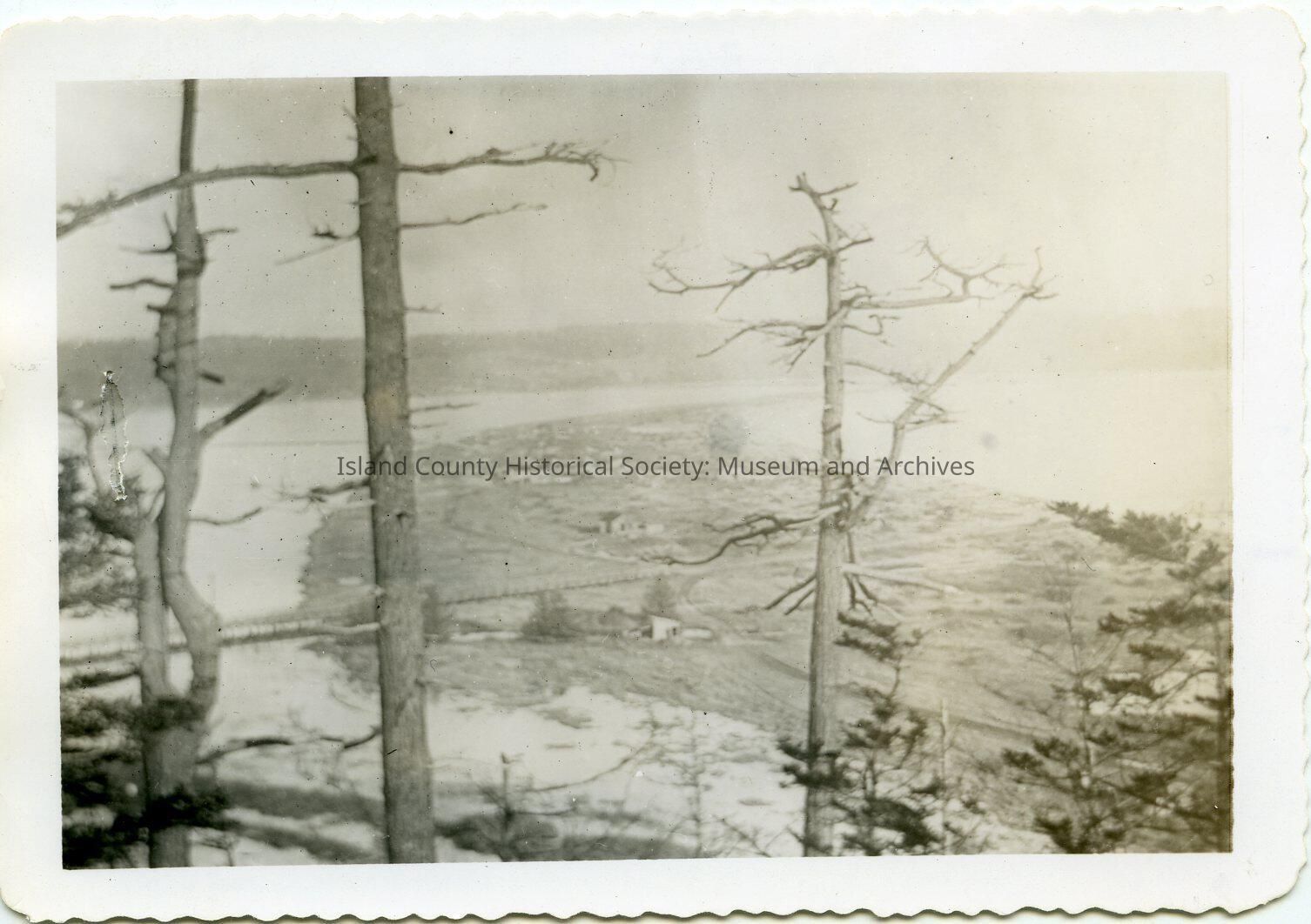 Photo looking down on Crockett Lake and the spit. Bare trees are in the foreground. The bridge is in the center and another structure is barely visible beyond it. There are houses on the spit. A wharf with a building is on the far right.