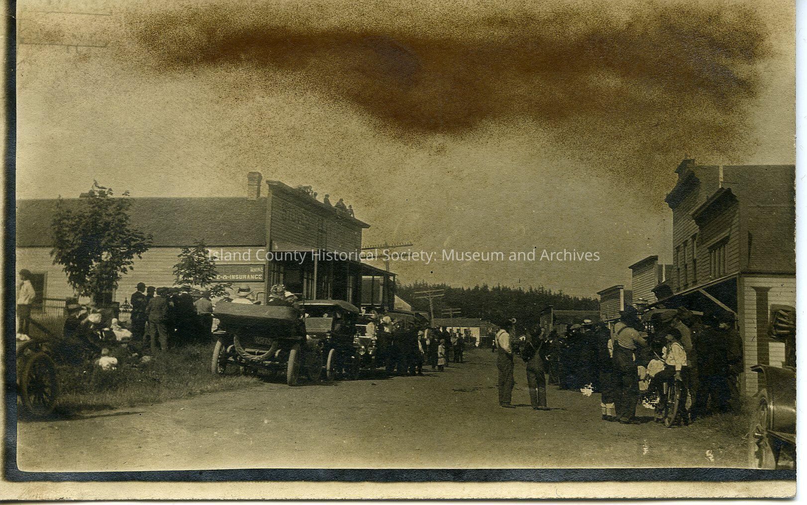 A photo of a downtown street with buildings, people and cars. Handwritten on the back is "Harvey Hill Store. Oak Harbor."Made/Created