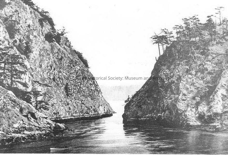 Photo with negative: Boat going through Canoe Pass, Deception Pass
