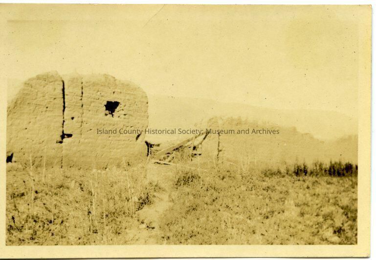 A black and white photo of a ruins, probably a church. Large wall with a collapsed doorway. Adobe or brick or stone. Related photos: 2015.074.300-.311.