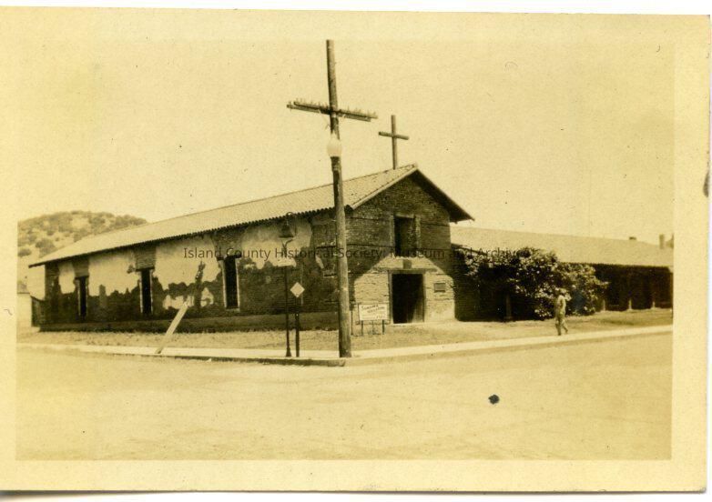 A black and white photo of an old brick or adobe church, front door open, long building, paint or whitewash only on top part of the side, telephone pole in front, cross on the roof, another building is leading off from its left. A man is walking in front on the sidewalk.