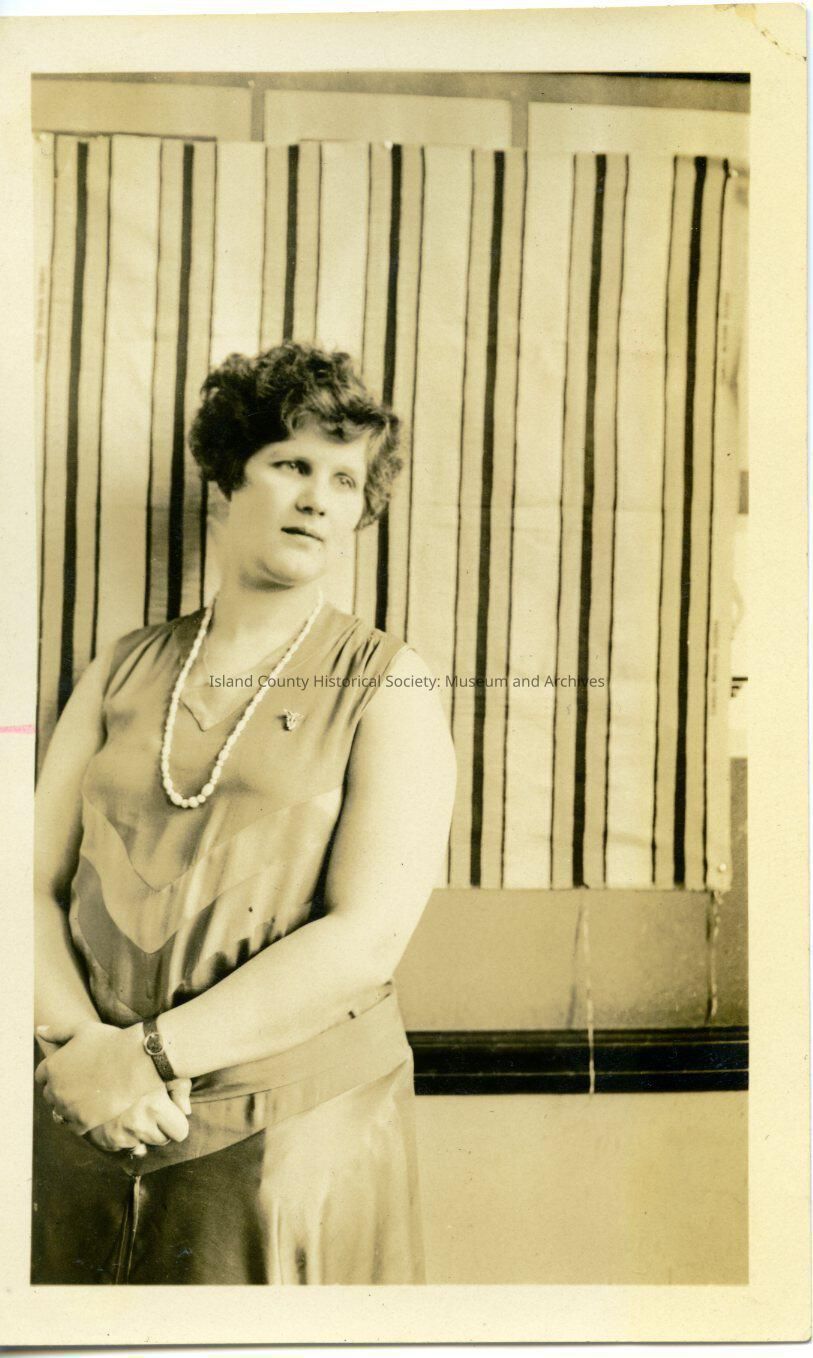 A black and white photo of woman in a sleeveless dress, necklace, watch, with her hands crossed at her waist, looking slightly over her left shoulder. She is standing in front of a striped window shade.