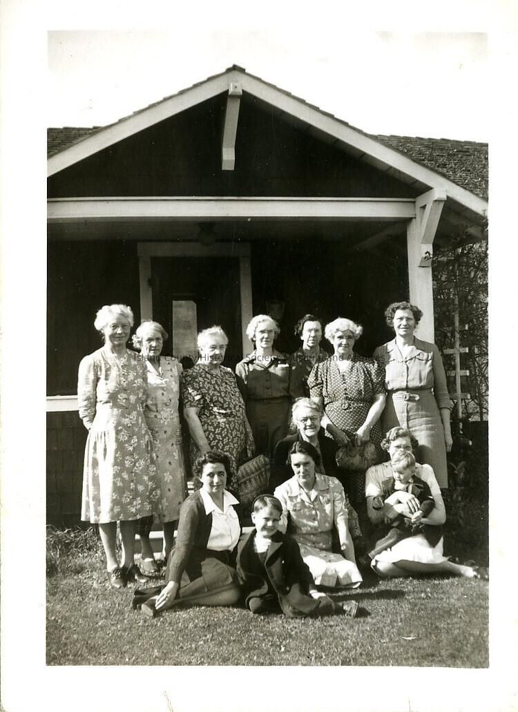Dorcas: Clara Benson, Libie Fisher, Mamie Monroe, Celia Libby, Mary Anderson, Eva Arnold, Anna Morris, Nell Benson, Janett Grasser, Madelin Darst, and Dora Arnold in front of a house.Made/Created