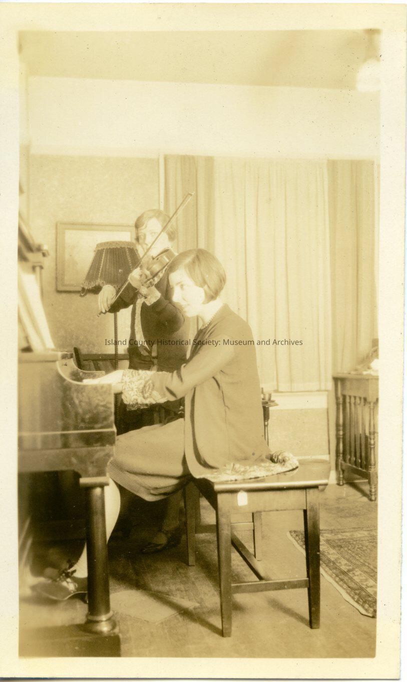 A black and white photo of a woman playing piano seated on the bench, another woman is standing behind her playing the violin. The pianist is wearing a jacket and skirt suit with a design on the bottom of the sleeves and hip-length jacket.