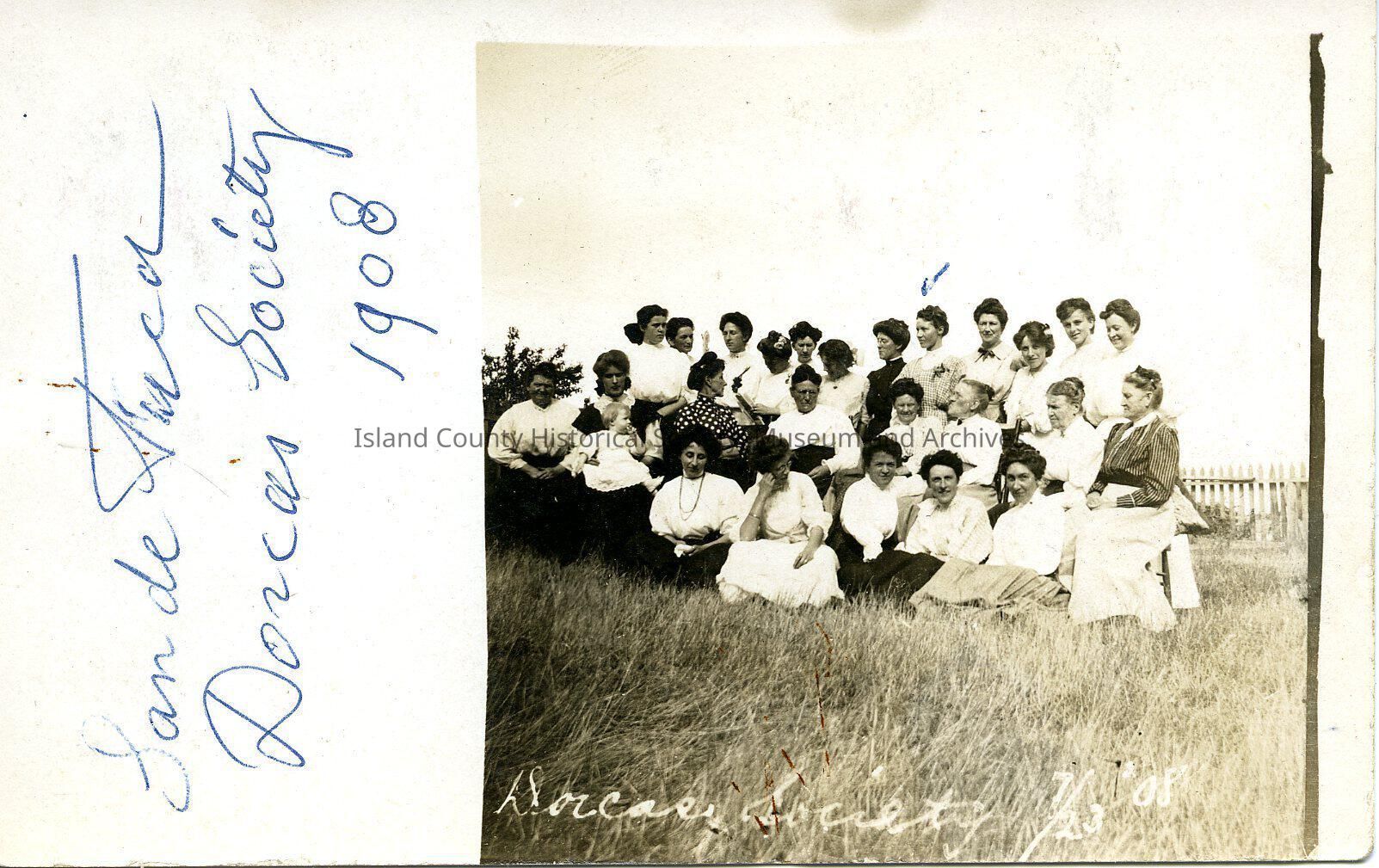 Dorcas Society 1908 in San De Fuca. Group of Women sitting and standing on grass by a picket fence. 2nd row left: Small child in woman's lap.