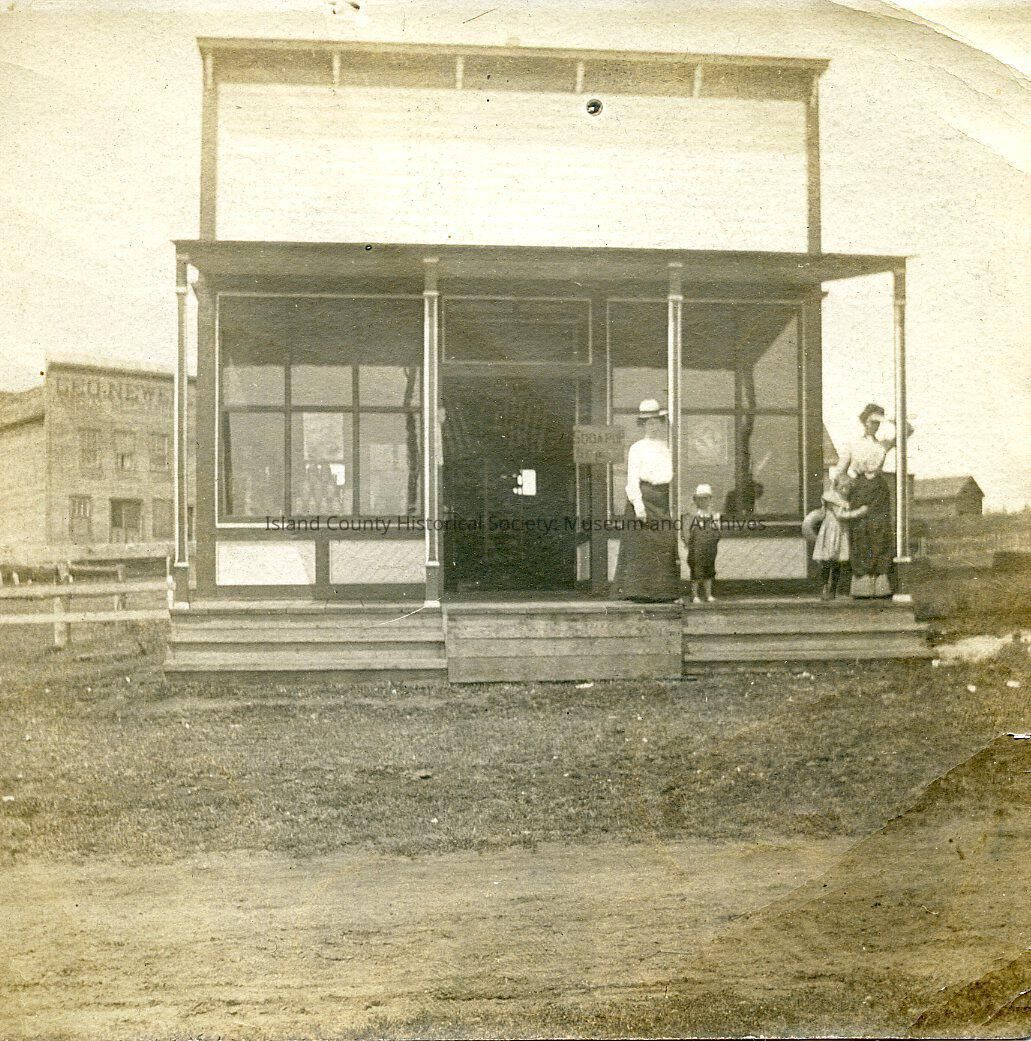 San De Fuca Store: A woman and young boy standing together, 2nd woman with young girl hugging her, standing on the porch of the store. There's a dirt road in front of store. There's a building to Left with a sign partially visable saying "GEO NEWE". A building in the distance to the right of the store.