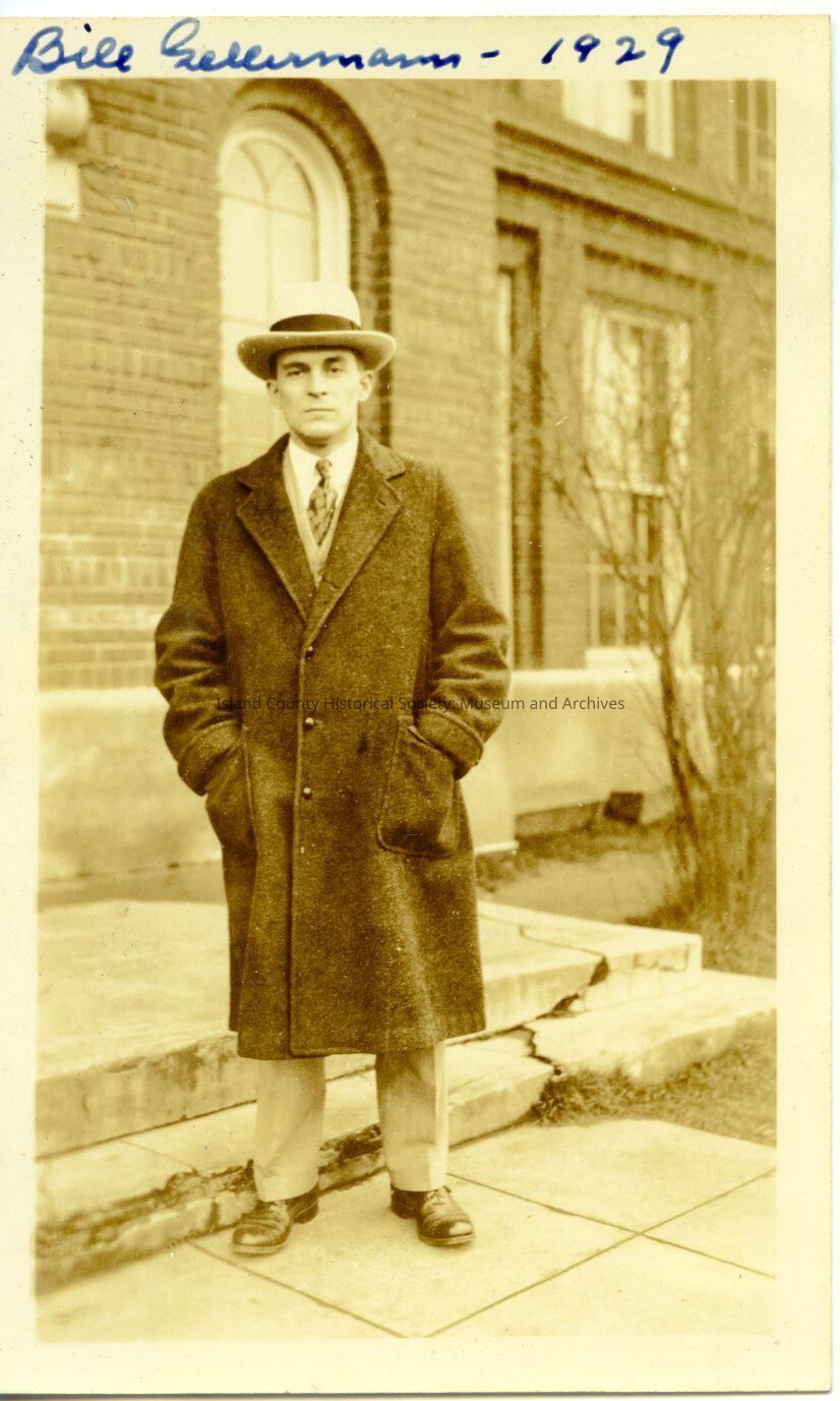 A black and white photo of a man in an overcoat, hat, standing outside a brick building. On the top: "Bill Gellermann - 1929"