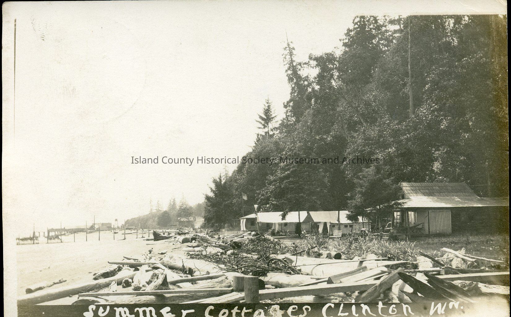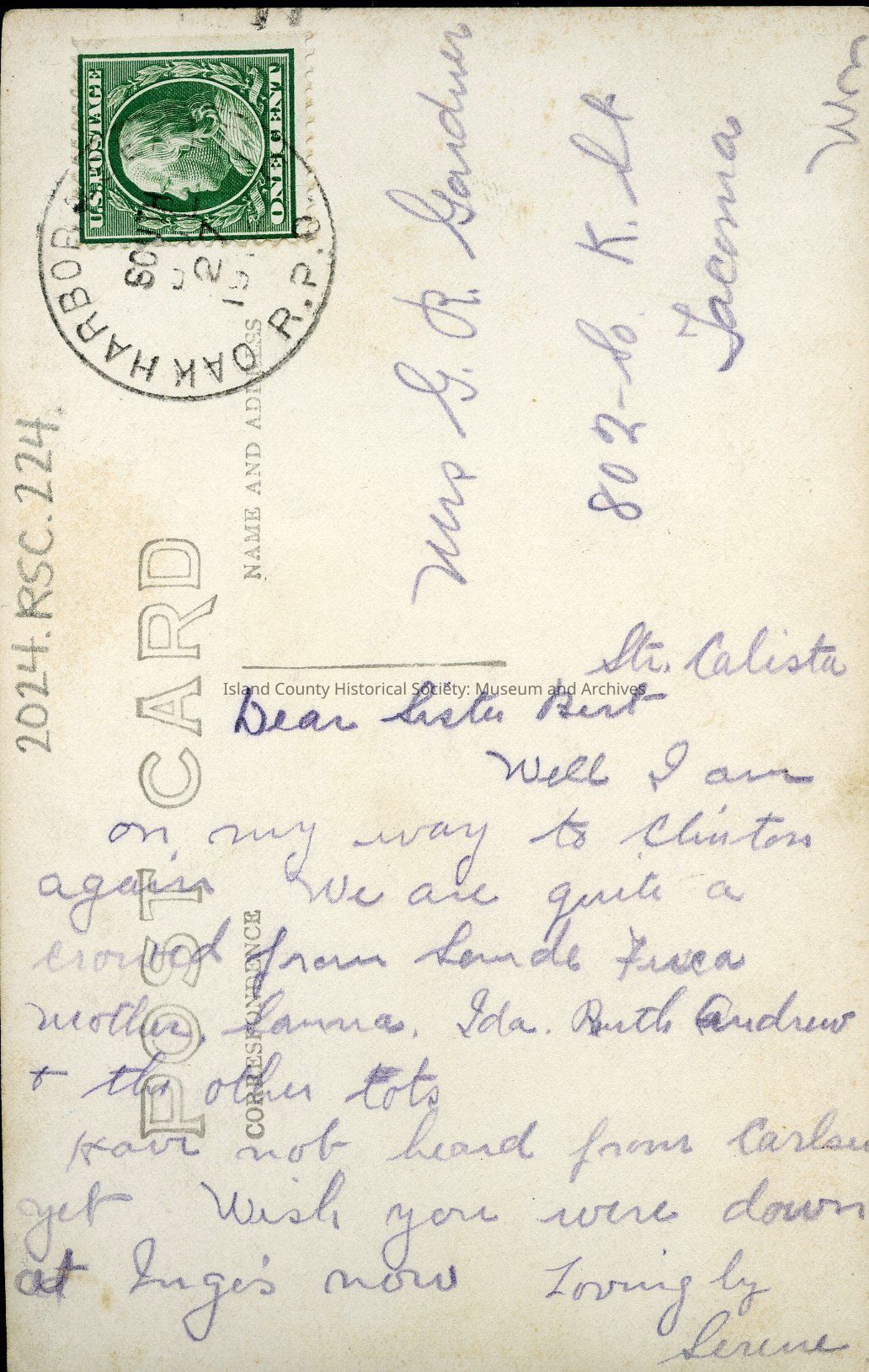 Postcard showing summer cottages in Clinton, Washington, c. 1910s. Addressed to Mrs. G.R. Gardner of Tacoma, Washington. The handwritten message on the reverse of the postcard reads, "(From Str. Calista) Dear Sister Gert, Well I am on my way to Clinton again. We are quite a crowd from San de Fuca. Mothers Laura, Ida, Ruth Andrew, and the other tots. Have not heard from Carlson yet. Wish you were down at Inge's now. Loving by (Irene/Serene)."Collection
