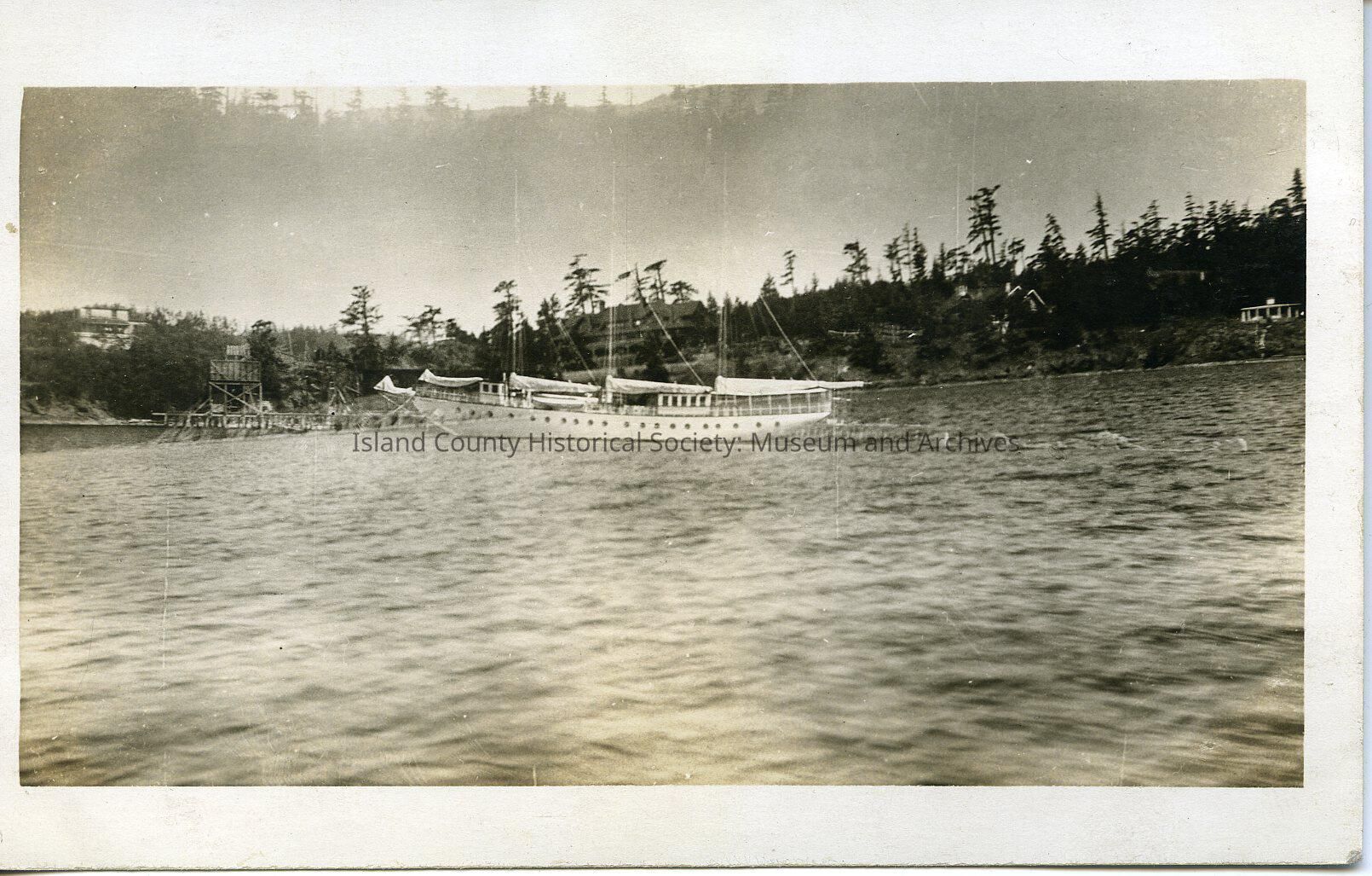 A double-exposed photo of a two to three masted sailboat on water.Made/Created