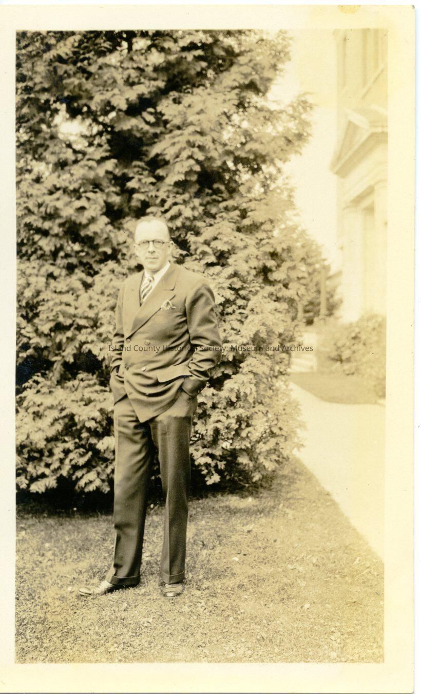 A black and white photo of a man wearing a suit, glasses, hands in his pockets standing outside a large buiding in the lawn beside a large tree. George Kellogg.