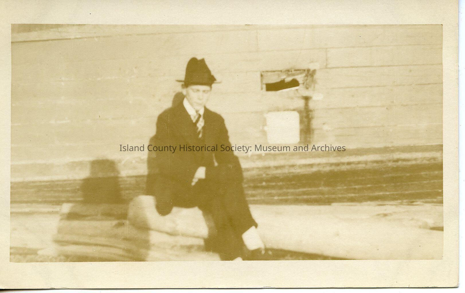 A photo of a sitting on a log (?), with a suit and hat on him.Made/Created