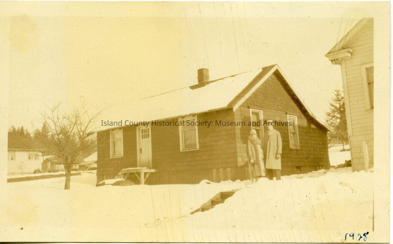 A black and white photo of a small house in winter - snow on the roof and ground. A man and woman in coats and hats are standing beside the house. Related photos: 2015.074.328 and 2015.074.332.
