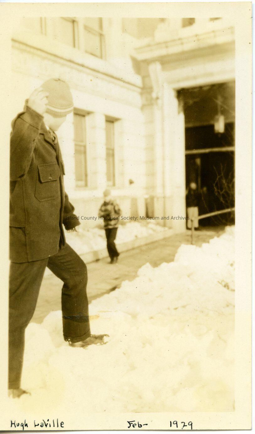A black and white photo of two young men throwing snowballs - one is on a sidewalk beside a large building, thee other on top of a snow mound. On the bottom: "Hugh LaVille Feb 1929"