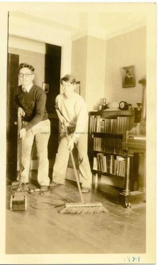A black and white photo of two young men one with a brrom and one with an electric sweeper cleaning the floor of the room. Books and bookcase, piano. Print on the wall. On the bottom: "1929"