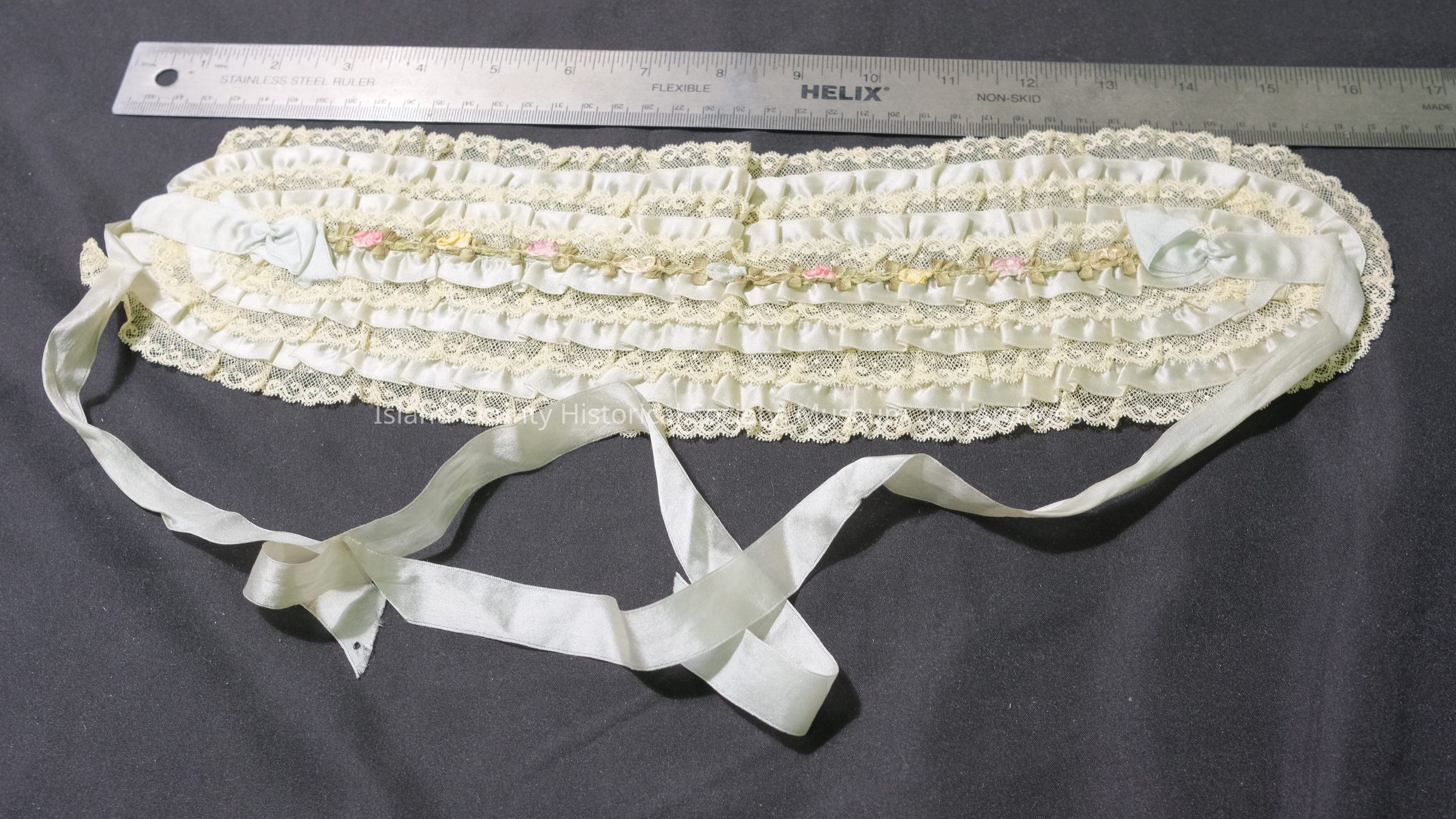 Ribbon bandeau with lace trim.