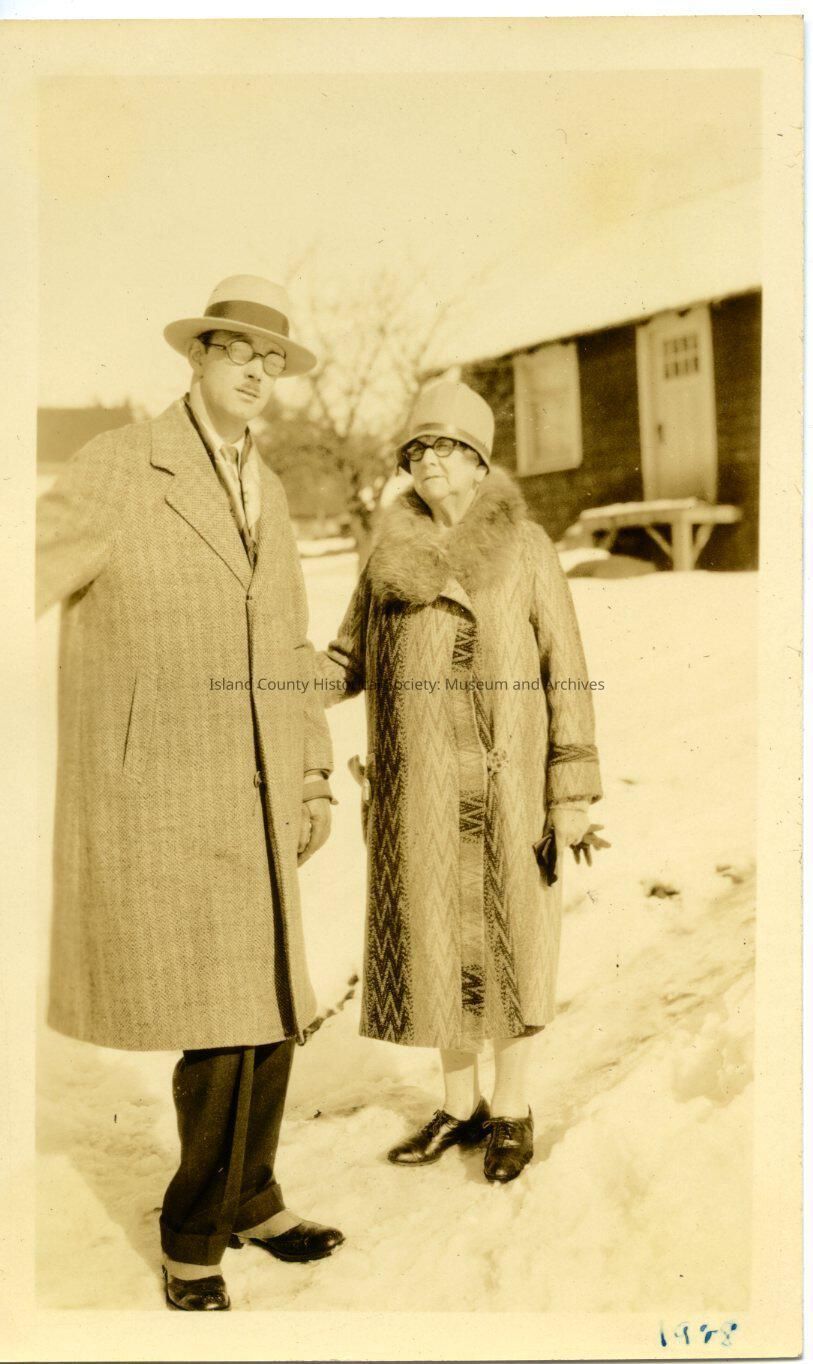 A black and white photo of a small house in winter - snow on the roof and ground. A man and woman in coats and hats are standing in front of the house. He is wearing a hat, overcoat, glasses and gloves. She is older, wearing a hat, glasses, overcoat with a fur collar and holding gloves in her left hand. Her right hand is on his left elbow. On the bottom: "1928"