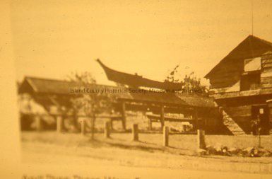 Photograph of canoes and the Alexander Blockhouse situated outside the Island County Historical Society and Museum, captioned "And Then There Were Four". Photo likely c. early 1900s.Photograph Details
