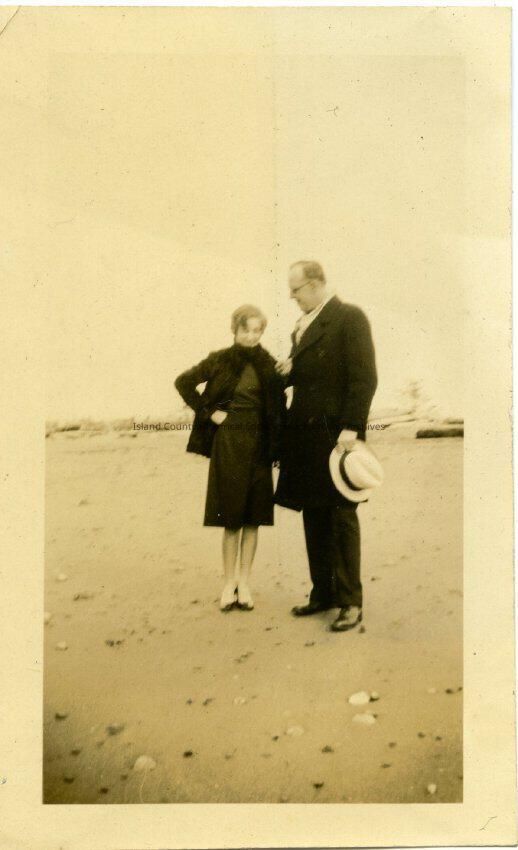 A black and white photo of a man standing beside a young woman. They are on the beach. She is wearing a dress and coat, he is wearing an overcoat and scarf and holding a hat in his left hand. George A Kellogg. Related photos: 2015.074.338-.339