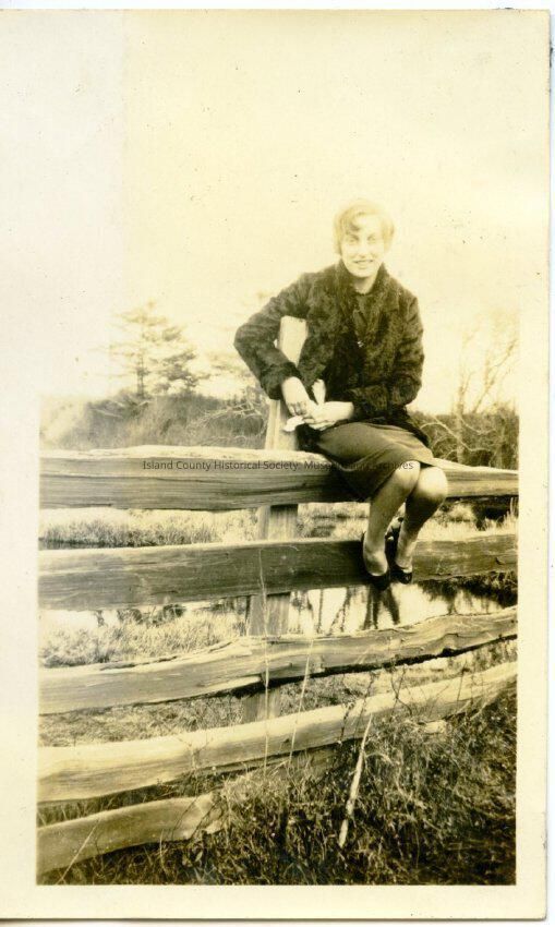 A black and white photo of a young woman sitting on a split rail fence. She is wearing a dress and coat. Related photos: 2015.074.338-.339