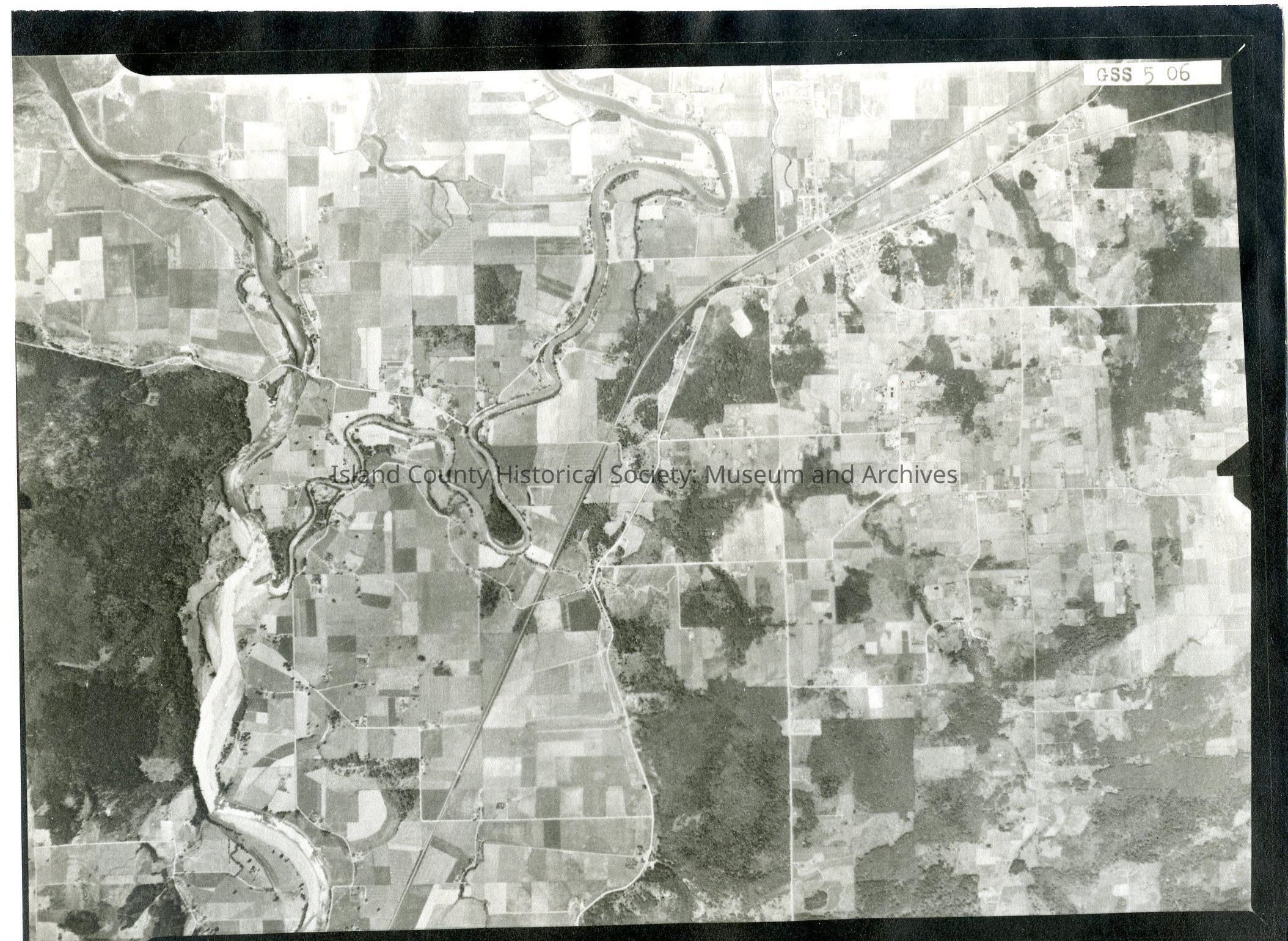 Donated by Island Conservation District Taken on 11 June 1941 7-10-41 GS S 5 06 Image of farmland and river with a town in the top center. Reads stanwood on the back Adjacent to 2015.23.119 See GIS for digital copies.