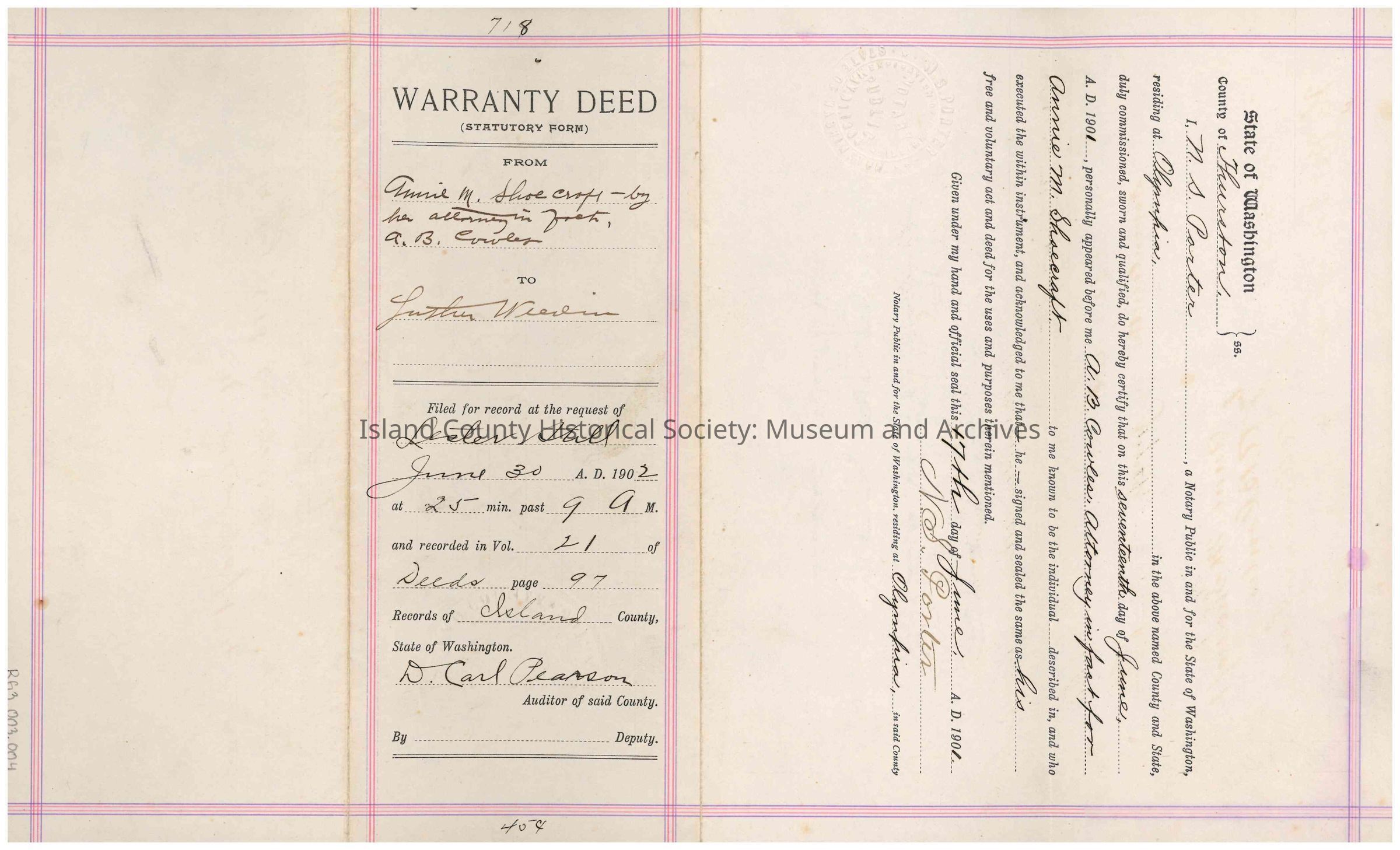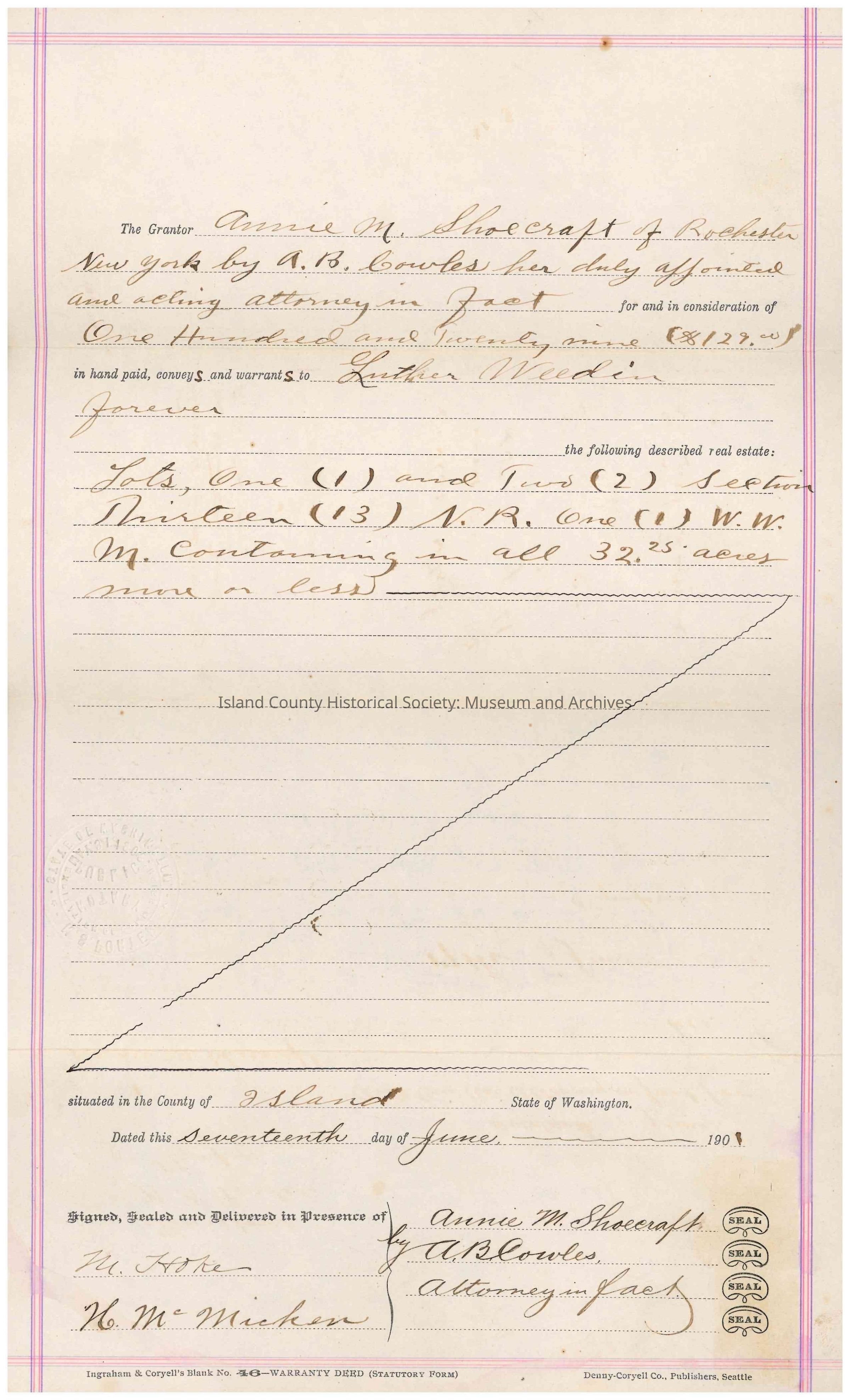Warranty Deed from Annie M. Shoecraft to Luther Weedin, c. 30th June, 1902. This Warranty Deed is for the value of $129 dollars and for the following portions of land in Island County: "Lots one (1) and Two (2) section Thirteen (13) N.R. One (1) W.W. M. continuing in all 32.25 acres more or less."Collection