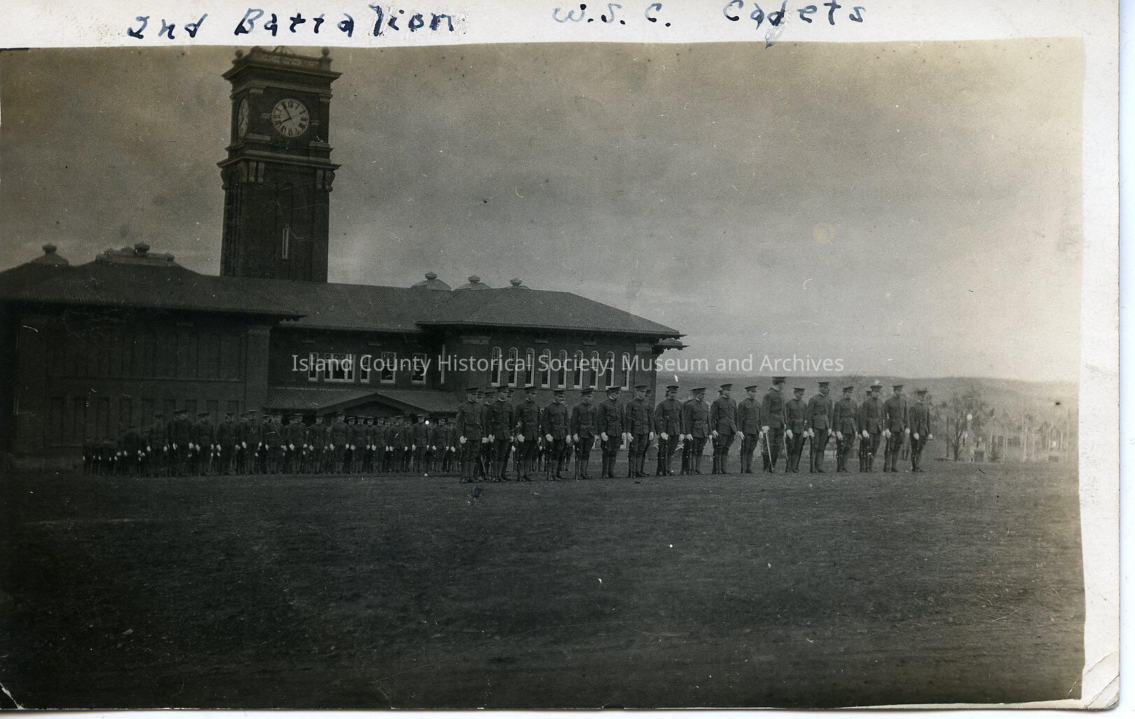 A photo of a line of men in front of a long building with a clock tower. Handwritten on the front is "2nd Battalion W.S.C. Cadets." Handwritten on the back is "The building in the background is the auditorrium and Library. The day was too cloudy for a good picture. 203 Ferry Hall, Pullman, Wa. 3-3-'15 Dear Monk: Just a card to let you know I'm alive and like it fine here. I'm pretty well settled down to work and have been initiated. The weather has been great lately, given me spring fever. This is a picture I took. (etc.) Mr. Harold Hill, Oak Harbor, Wash."